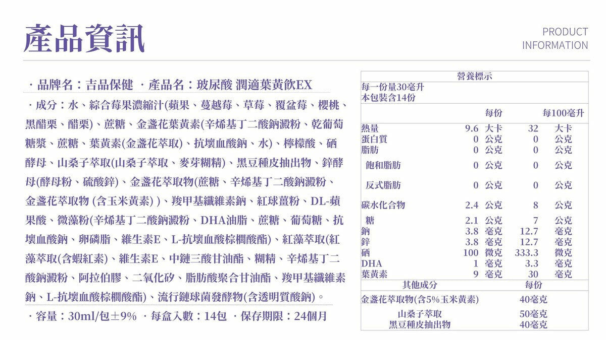 ◆成分:水、綜合莓果濃縮汁(蘋果、蔓越莓、草莓、覆盆莓、櫻桃、黑醋栗、醋栗)、蔗糖、金盞花葉黃素(辛烯基丁二酸鈉澱粉、乾葡萄糖漿、蔗糖、葉黃素(金盞花萃取)、抗壞血酸鈉、水)、檸檬酸、硒酵母、山桑子萃取(山桑子萃取、麥芽糊精)、黑豆種皮抽出物、鋅酵母(酵母粉、硫酸鋅)、金盞花萃取物(蔗糖、辛烯基丁二酸鈉澱粉、金盞花萃取物 (含玉米黃素) )、羧甲基纖維素鈉、紅球薑粉、DL-蘋果酸、微藻粉(辛烯基丁二酸鈉澱粉、DHA油脂、蔗糖、葡萄糖、抗壞血酸鈉、卵磷脂、維生素E、L-抗壞血酸棕櫚酸酯)、紅藻萃取(紅藻萃取(含蝦紅素)、維生素E、中鏈三酸甘油酯、糊精、辛烯基丁二酸鈉澱粉、阿拉伯膠、二氧化矽、脂肪酸聚合甘油酯、羧甲基纖維素鈉、L-抗壞血酸棕櫚酸酯)、流行鏈球菌發酵物(含透明質酸鈉)