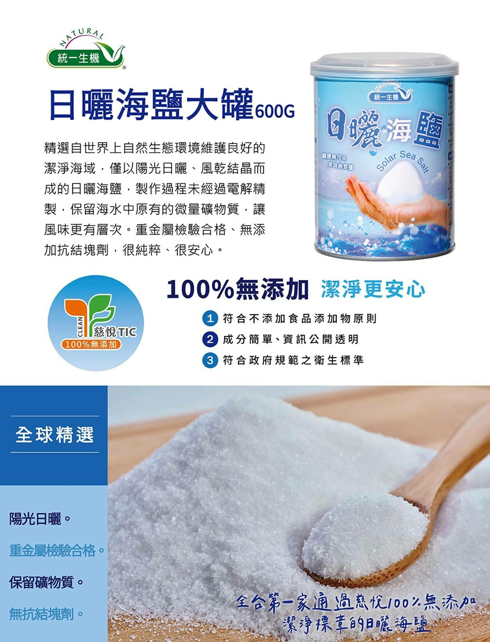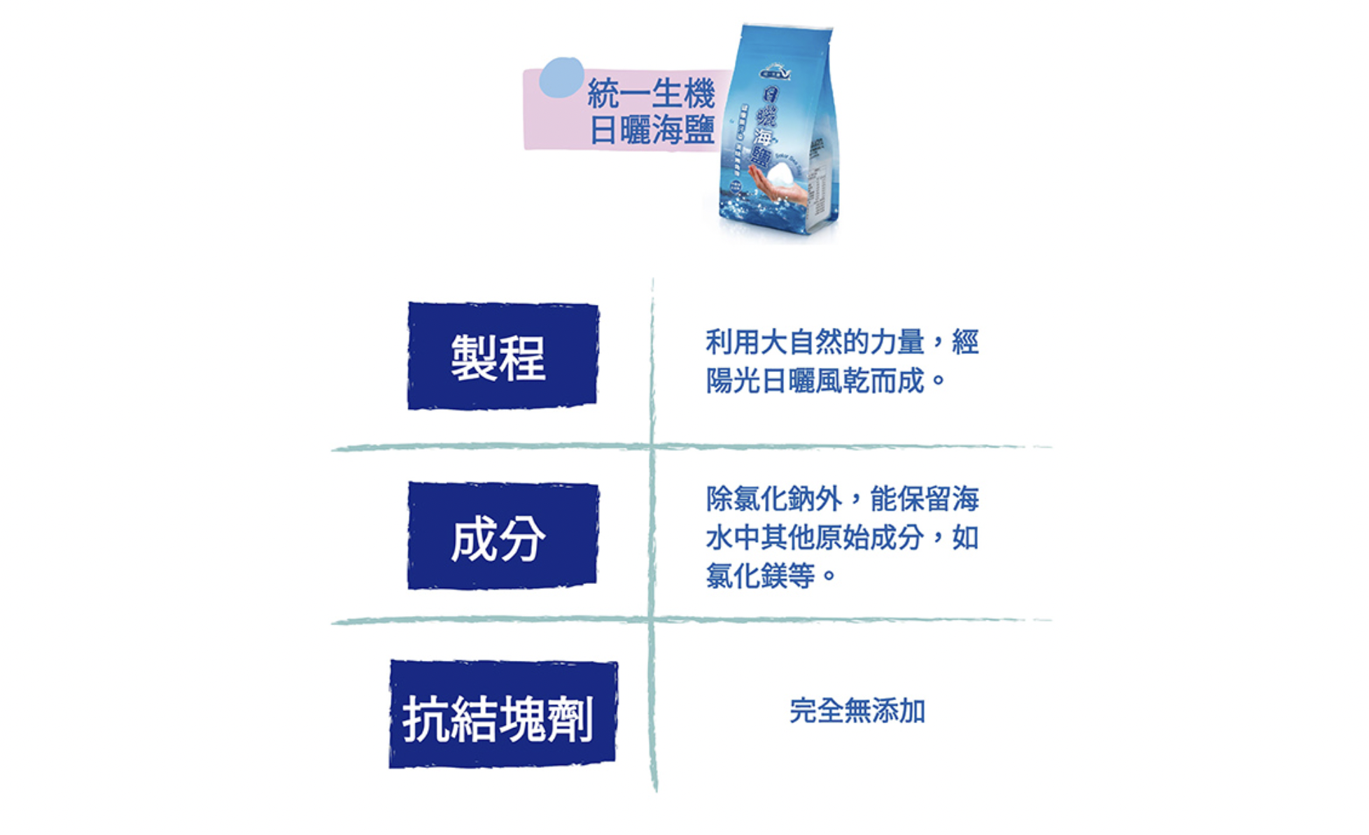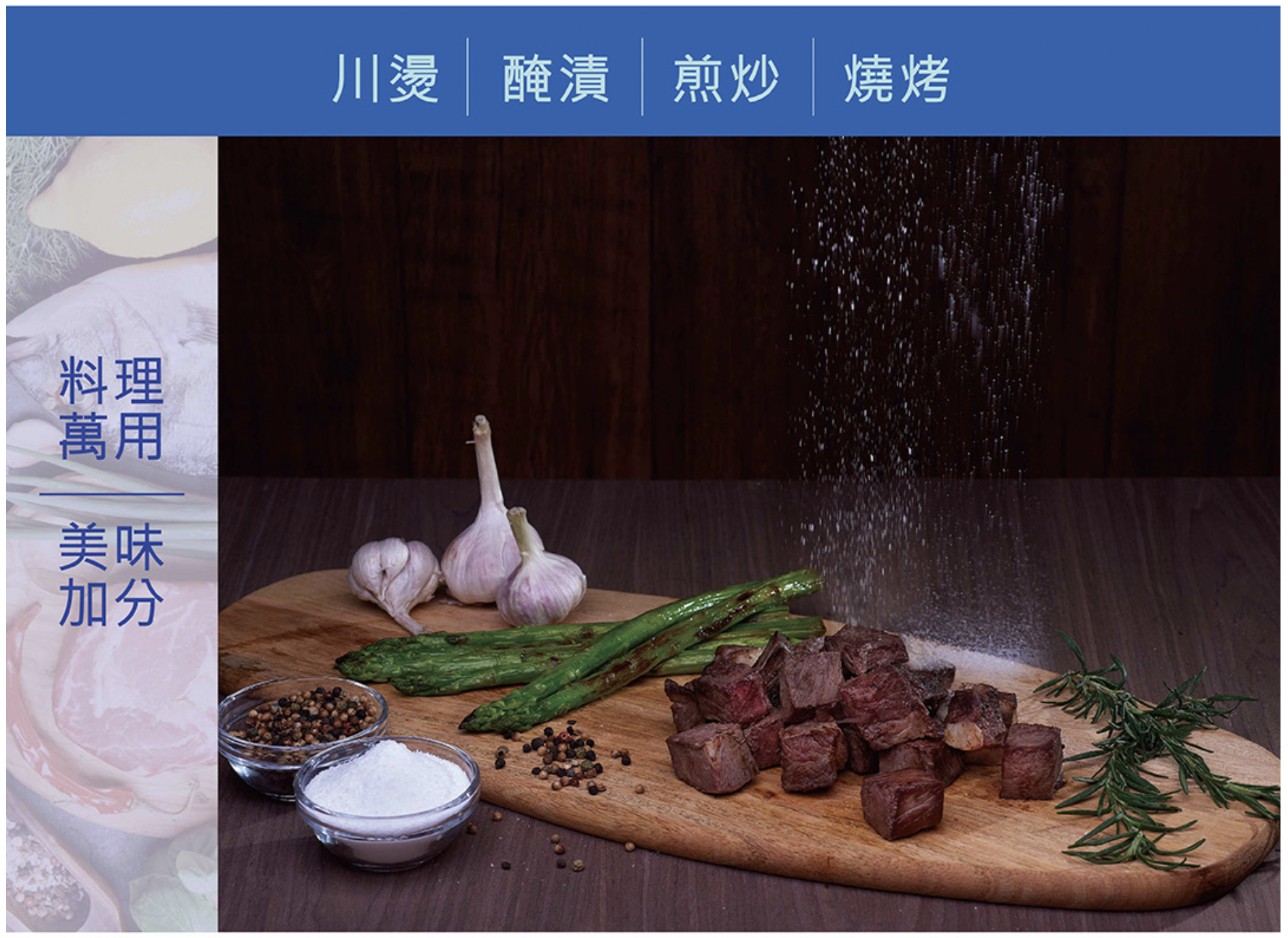 日曬海鹽除氯化鈉之外,保留了海水中的微量元素(鉀、鈣、鎂)。細細品嘗,會發現除了鹹味之外,還有一絲甘甜,酌量添加於料理中更能帶出食物原始的風味,讓料理層次更加豐富。
