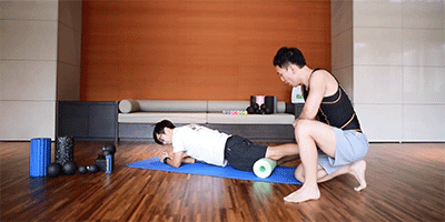 ![]() | ►舒緩部位:腿部 / 股外側肌 ►使用教學:趴著,利用雙手手肘支撐,單腿大腿前側放置滾輪上,將另一腿疊上後可增加按摩力道,身體前後平移,配合呼吸尋找激痛點,緩緩滾動滾輪。 ►動作次數:一個部位 30~40 秒 (依個人狀況調整) |
