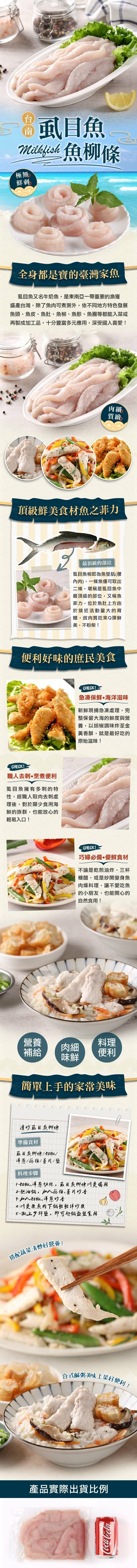 | ◆ 重量:300G±10%/包 ◆ 注意事項 : 商品由人工去骨去刺,食用時仍需留意細刺。 ◆ 商品產地:台灣 ◆ 商品狀態:-18度c冷凍 ◆ 保存期限:24個月 |