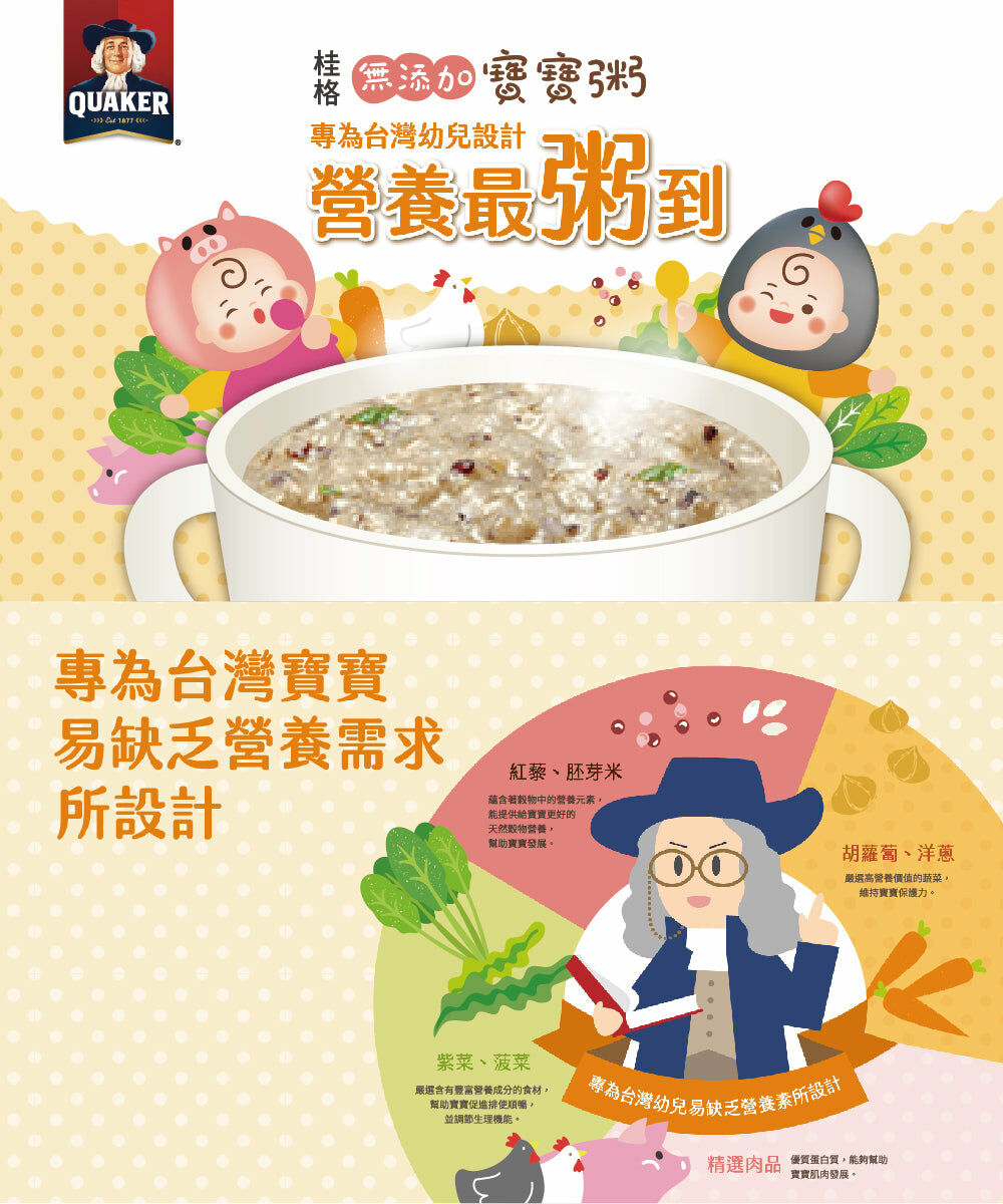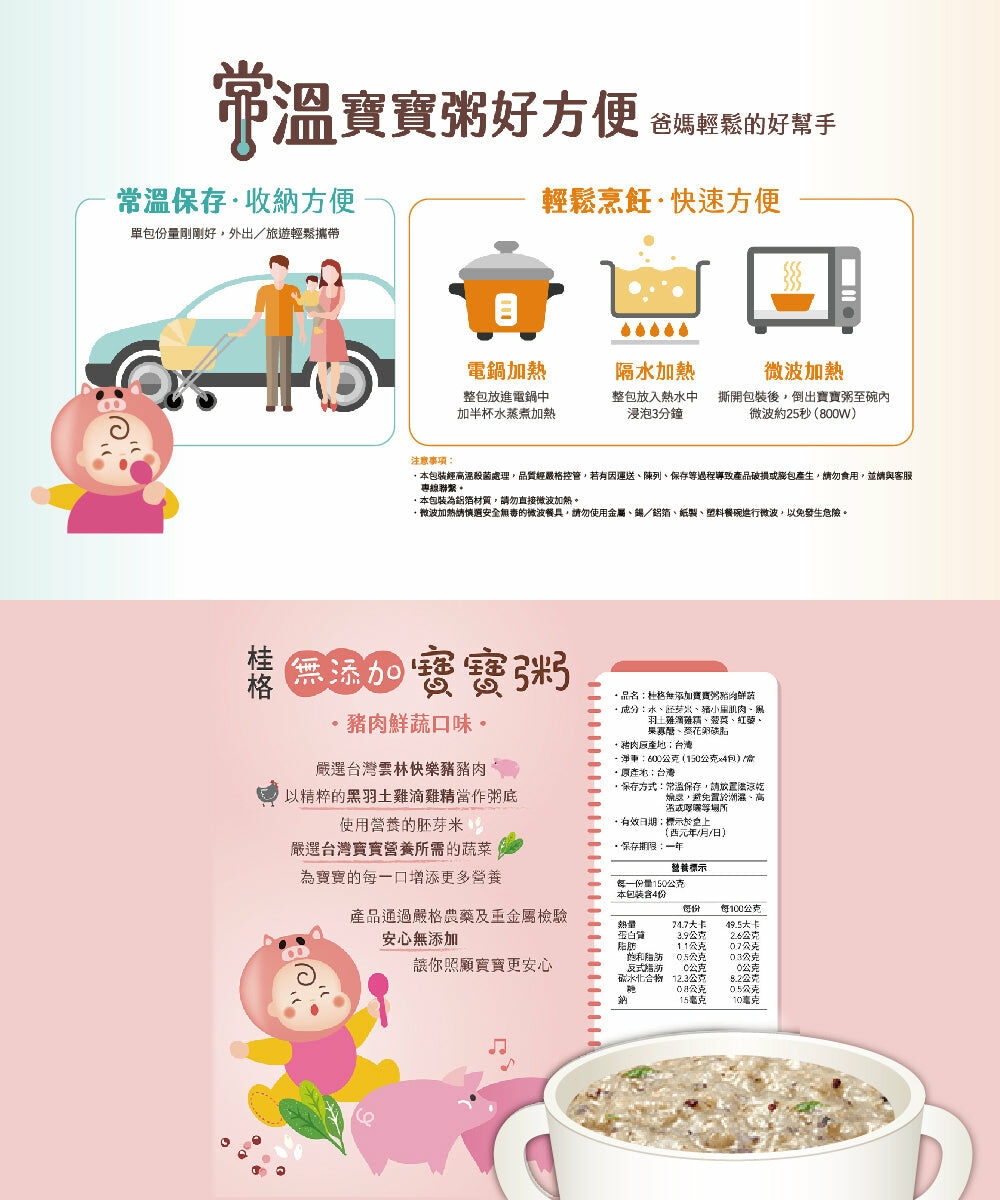 | ◆品名:【桂格】寶寶粥豬肉鮮蔬150G*4包 ◆規格: 150Gx4包/盒 ◆成份:水、胚芽米、豬小里肌肉、黑羽土雞滴雞精、菠菜、紅藜、果寡醣、葵花卵磷脂 ◆產地:台灣 ◆保存期限:12個月 ◆保存方式:常溫保存,請置於陰涼乾燥處,避免置於潮濕、高溫、曝曬等場所 ◆有效期限:標示於外包裝上(西元年/月/日) ◆食用說明: 【電鍋加熱】整包放入電鍋中,加入半杯水蒸煮加熱 【隔水加熱】整包放入熱水中浸泡3分鐘 【微波加熱】撕開包裝袋,倒出寶寶粥至碗內,微波約25秒(800W) |