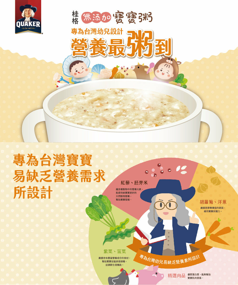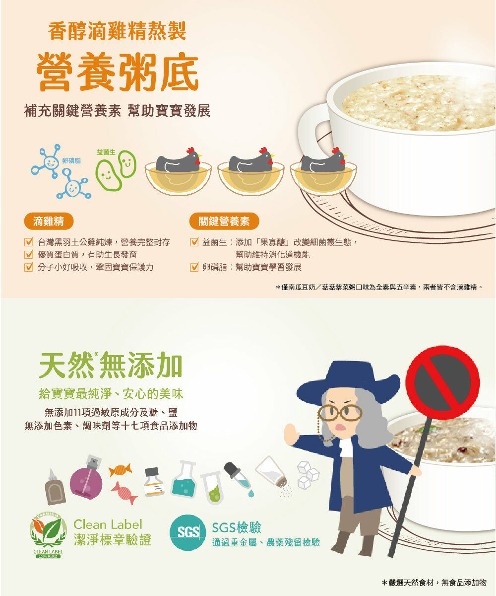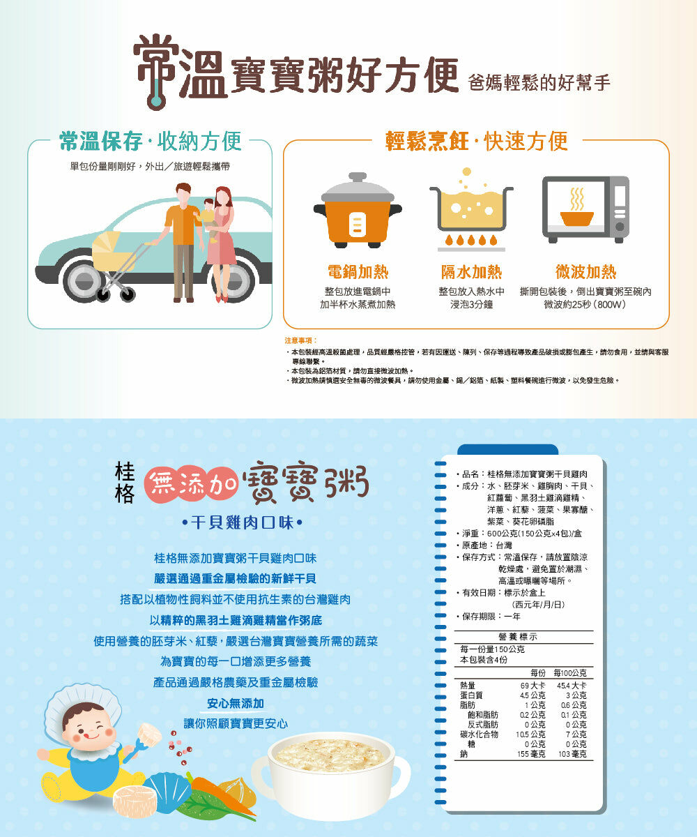 | ◆品名:【桂格】寶寶粥干貝雞肉150G*4包 ◆規格:150Gx4包/盒 ◆成份:水、胚芽米、雞胸肉、干貝、紅蘿蔔、黑羽土雞滴雞精、洋蔥、紅藜、菠菜、果寡醣、紫菜、葵花卵磷脂 ◆產地:台灣 ◆保存期限:12個月 ◆保存方式:常溫保存,請置於陰涼乾燥處,避免置於潮濕、高溫、曝曬等場所 ◆有效期限:標示於外包裝上(西元年/月/日) ◆食用說明: 【電鍋加熱】整包放入電鍋中,加入半杯水蒸煮加熱 【隔水加熱】整包放入熱水中浸泡3分鐘 【微波加熱】撕開包裝袋,倒出寶寶粥至碗內,微波約25秒(800W) |