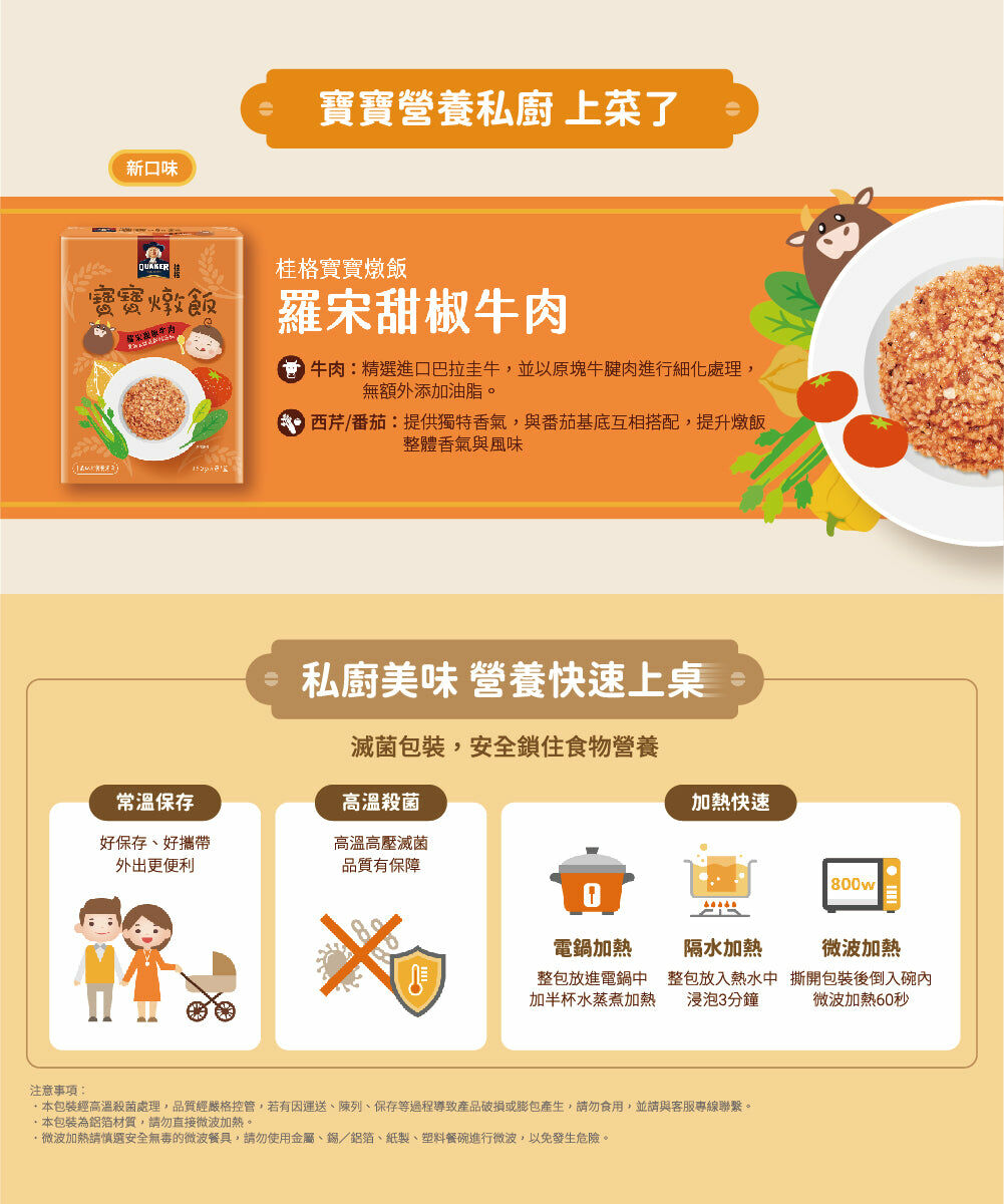 | ◆品名:【桂格】寶寶燉飯羅宋甜椒牛肉150G*3包 ◆規格:150Gx3包/盒 ◆成份:水、胚芽米、牛肉、洋蔥、番茄糊、西芹、黃甜椒、菠菜、葵花油、黑羽土雞滴雞精、維生素 E-抗氧化劑 ◆產地:台灣 ◆有效期限:12個月 ◆常溫保存,請置於陰涼乾燥處,避免置於潮濕、高溫、曝曬等場所。 ◆有效期限:標示於外包裝上(西元年/月/日) ◆食用說明: 【電鍋加熱】整包放入電鍋中,加入半杯水蒸煮加熱。 【隔水加熱】整包放入熱水中浸泡3分鐘。 【微波加熱】撕開包裝袋,倒出寶寶粥至碗內,微波約60秒(800W) ◆注意事項:過敏原資訊:本產品含有甲殼類、大豆、魚類 |