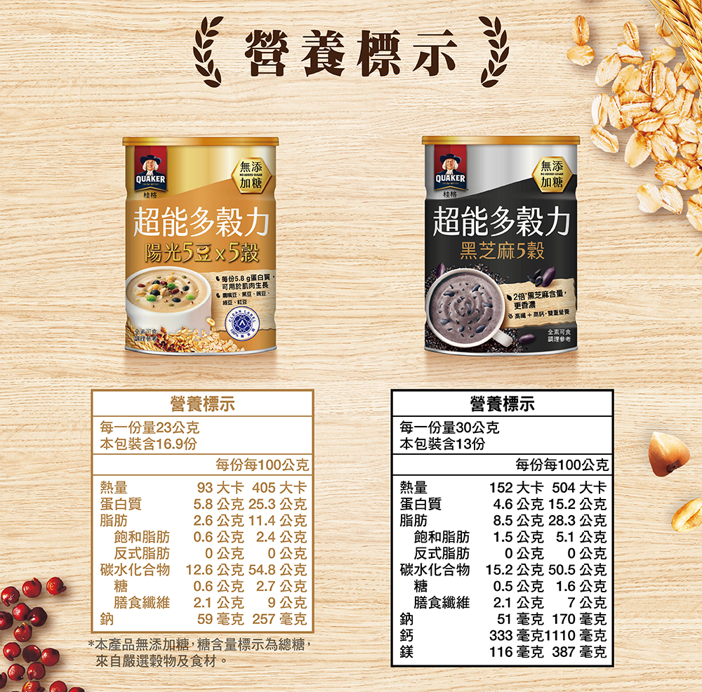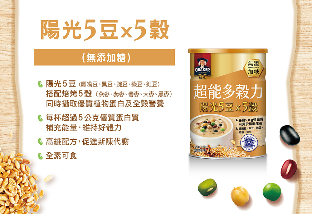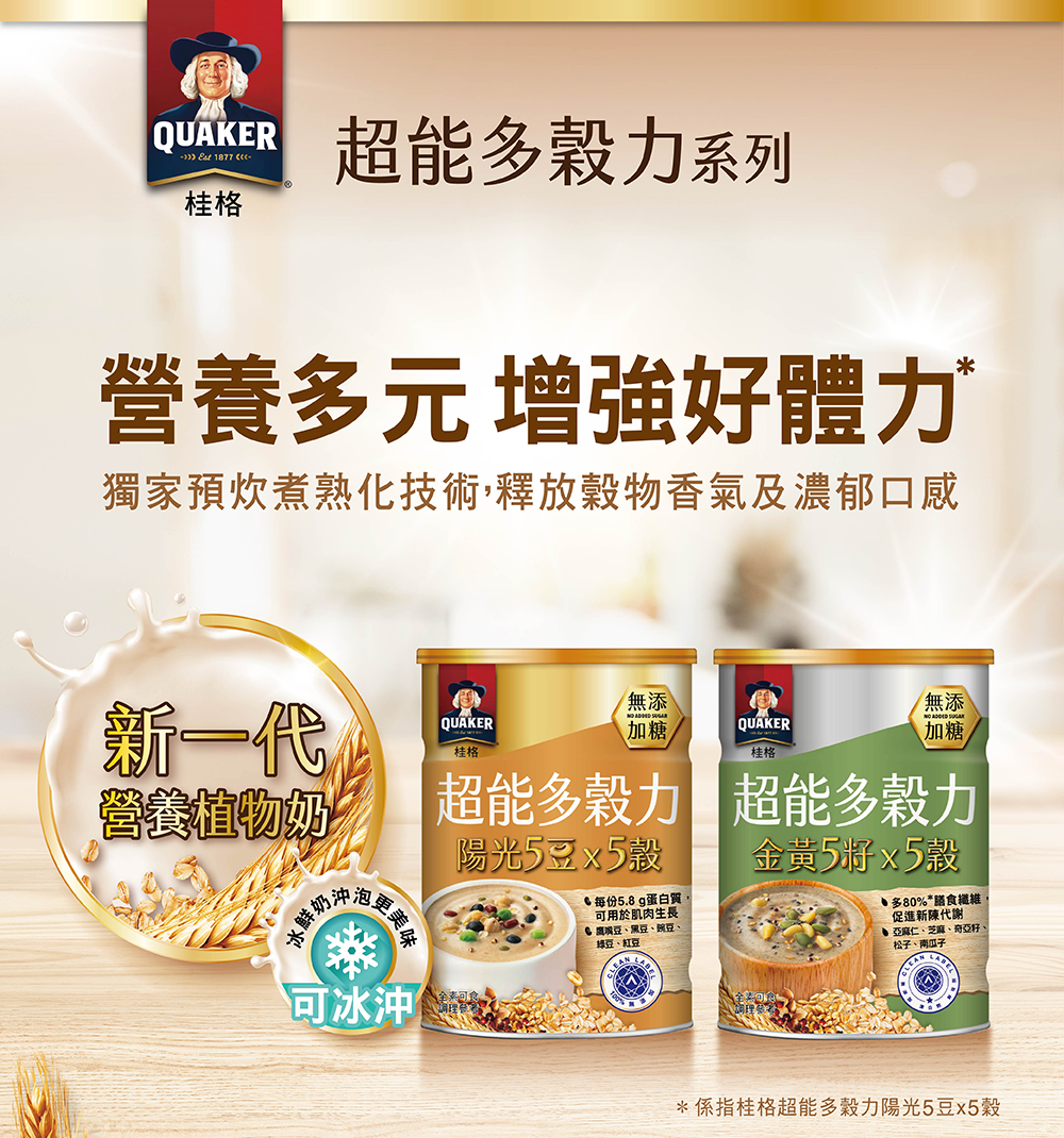 • 「桂格超能多穀力」含有維生素E,具抗氧化作用,減少不飽和脂肪酸的氧化;鋅,可增進皮膚健康;菸鹼素,有助於維持能量正常代謝。一天一杯「桂格超能多穀力」,是活力生活的好選擇。