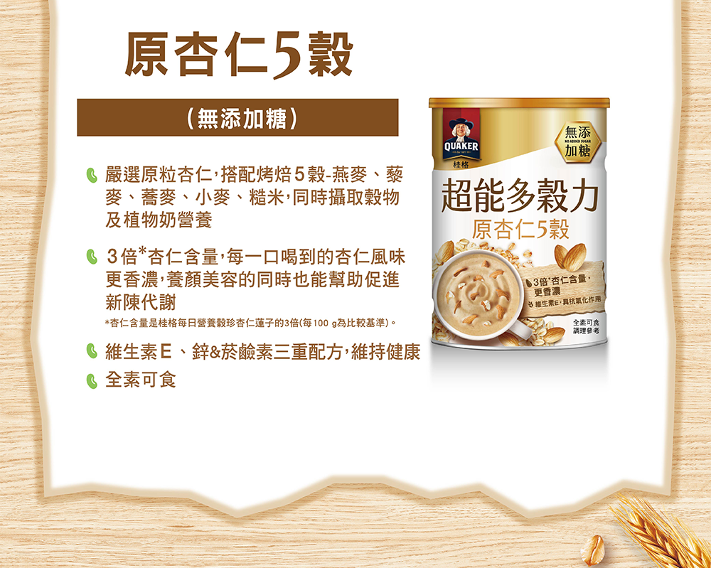 • 嚴選原粒杏仁,搭配烤焙5穀-燕麥、藜麥、蕎麥、小麥、糙米,同時攝取穀物及植物奶營養,3倍杏仁*含量,每一口喝到的杏仁風味;更香濃, 養顏美容的同時也能幫助促進新陳代謝。**杏仁含量是桂格每日營養穀珍-杏仁蓮子3倍。(每100 g為比較基準)