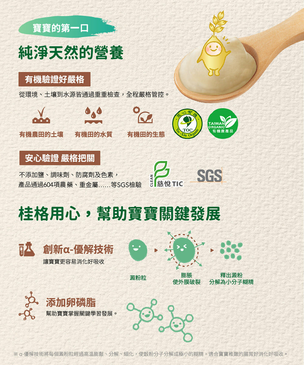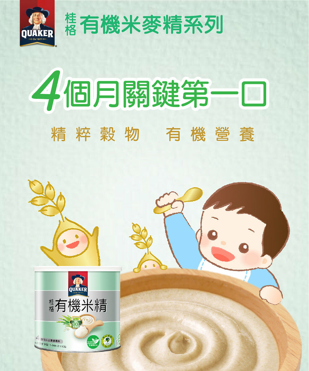 | ◆品名:【桂格】有機米精300G ◆規格: 300G/罐 ◆成份:有機糙米(台灣)、碳酸鈣、卵磷脂(含磷脂質)、天然香料。 ◆產地:台灣 ◆保存總效期:24個月 ◆保存方式:請置於陰涼乾燥處,並於開封30天內食用完畢,以確保產品最優良之品質。 ◆有效期限:標示於外包裝上(西元年/月/日) ◆食用說明:(1湯匙=30 c.c.奶粉匙)首次餵食將1湯匙加入180 c.c. 的溫開水中沖泡,再循序漸進調整濃稠度為糊餐,6-8匙加入120 c.c. 的水中沖泡成糊狀,建議每日2餐以上,以幫助寶寶咀嚼訓練。 ◆注意事項: 過敏原資訊:本產品含有大豆 |