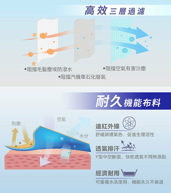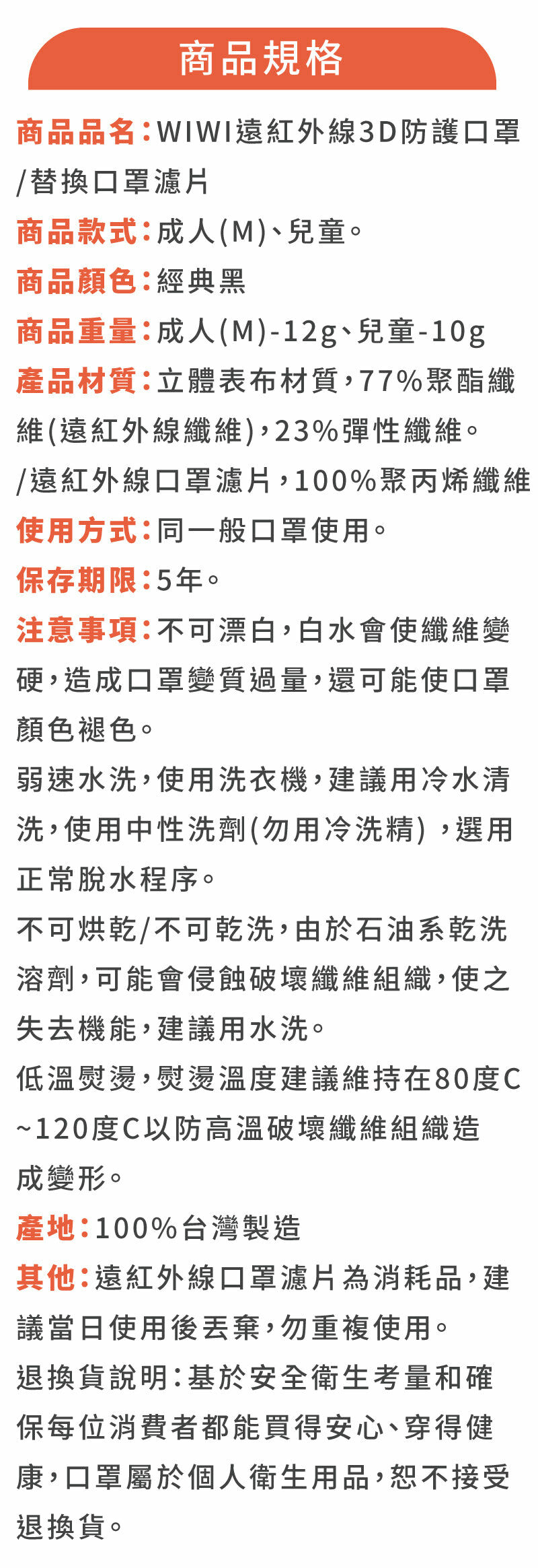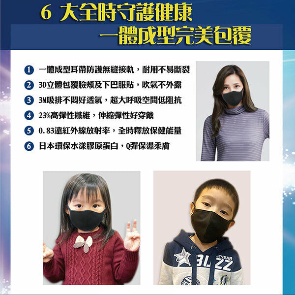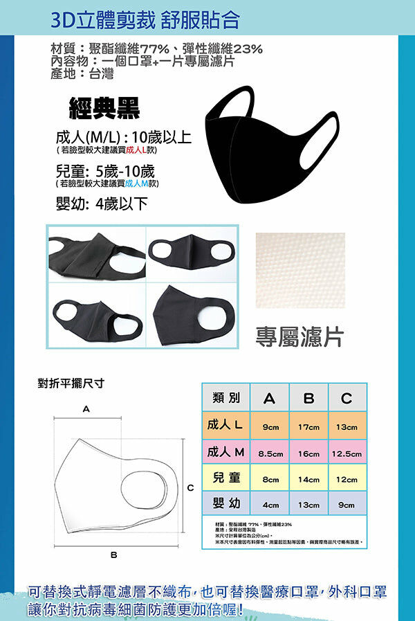| ◆ 款式:成人(L/M)、兒童、嬰幼兒。 ◆ 顏色:經典黑 ◆ 口罩材質:立體表布材質,77%聚酯纖維(遠紅外線纖維),23%彈性纖維。 ◆ 濾片材質:為醫療口罩中層熔噴不織布(遠紅外線口罩濾片,100%聚丙烯纖維),為消耗品,建議當日使用後丟棄,勿重複使用。) ◆ 使用方式:同一般口罩使用。 ◆ 保存期限:5年。 ◆ 產地:100%台灣製造 |