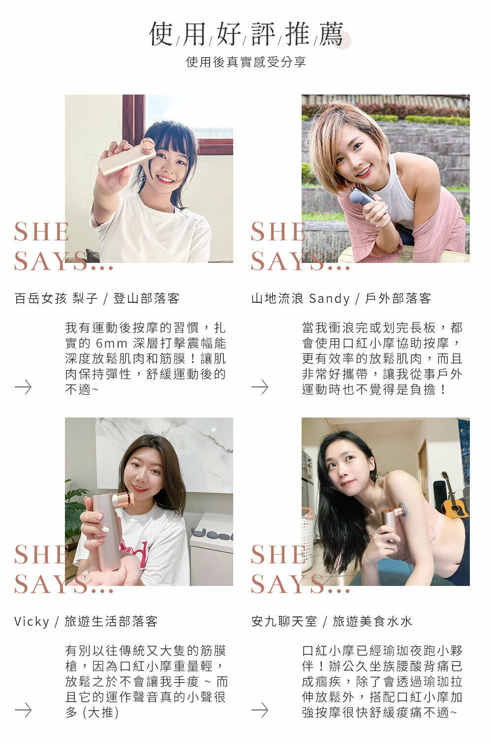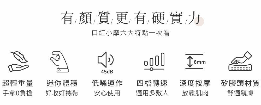 | ◆ 尺寸:122 * 63 * 35mm ◆ 重量:287 g ◆ 音量:45 dB ◆ 檔次:4 檔次 ◆ 轉速:1檔 1700、2檔 2000、3檔 2300、4檔 2600 ◆ 電池容量:1200mAh ◆ 充電時間:3 小時 ◆ 續航時間:4 小時 ◆ 內容物: 主機*1、收納包*1、充電線*1、按摩頭*4、說明書*1 ◆ 商品保固: 一年 |