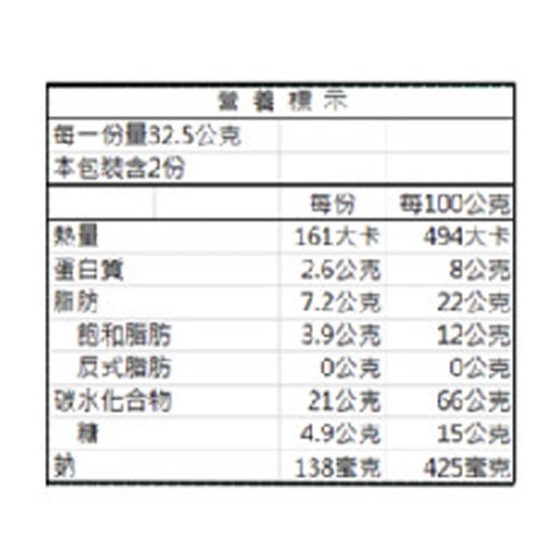 ◆ 原料:小麥麵粉、蔗糖、軟質棕油、椰子油、乳清粉、葡萄糖、乳酪粉(乾酪、檸檬酸鈉、乳清粉)、蛋白分解酵素(小麥粉、蛋白分解酵素)、彩虹藜麥(紅藜麥、白藜麥、黑藜麥)、小蘇打、日曬海鹽。