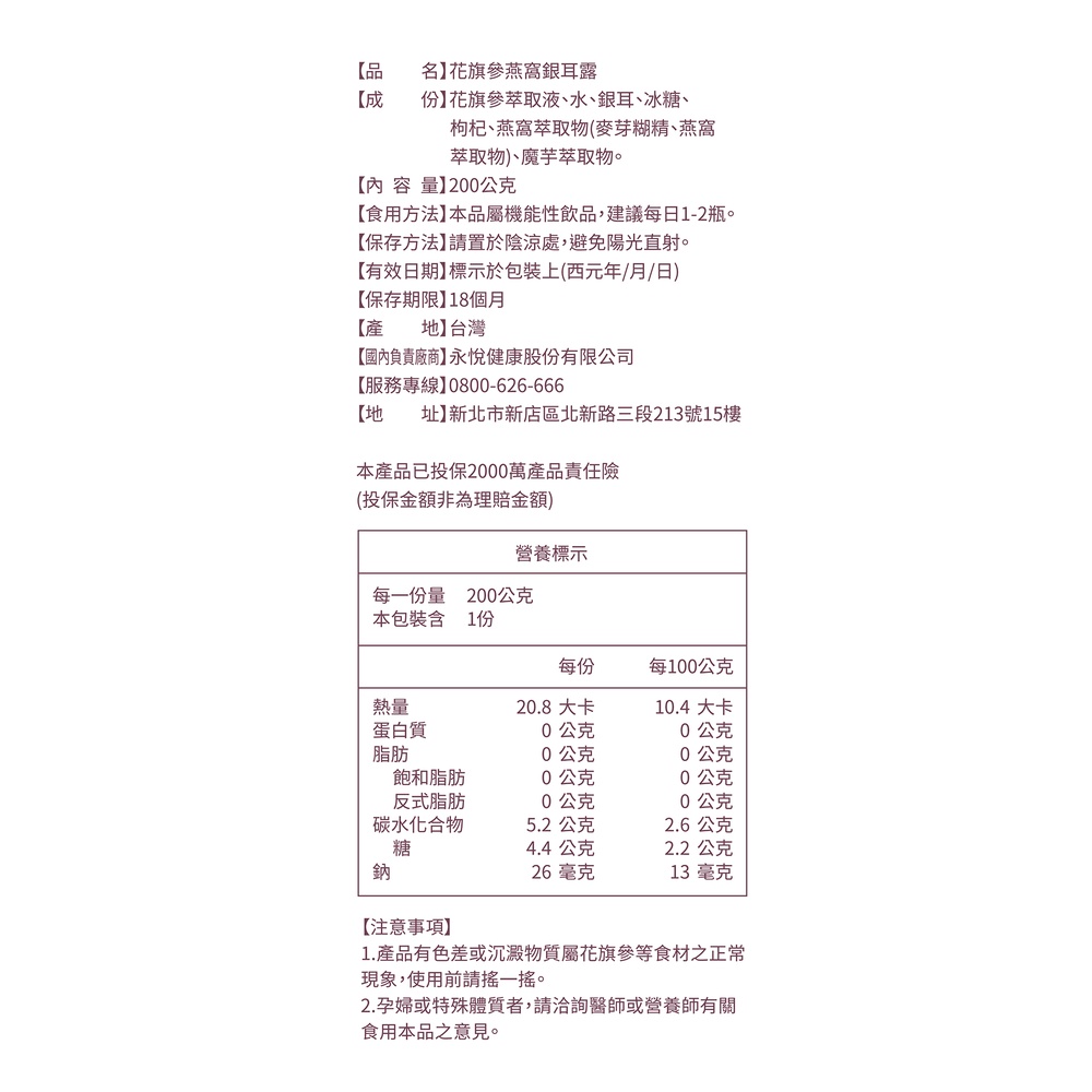 ◆成份:花旗參萃取液、水、銀耳、冰糖、枸杞、燕窩萃取物(麥芽糊精、燕窩萃取物)、魔芋萃取物