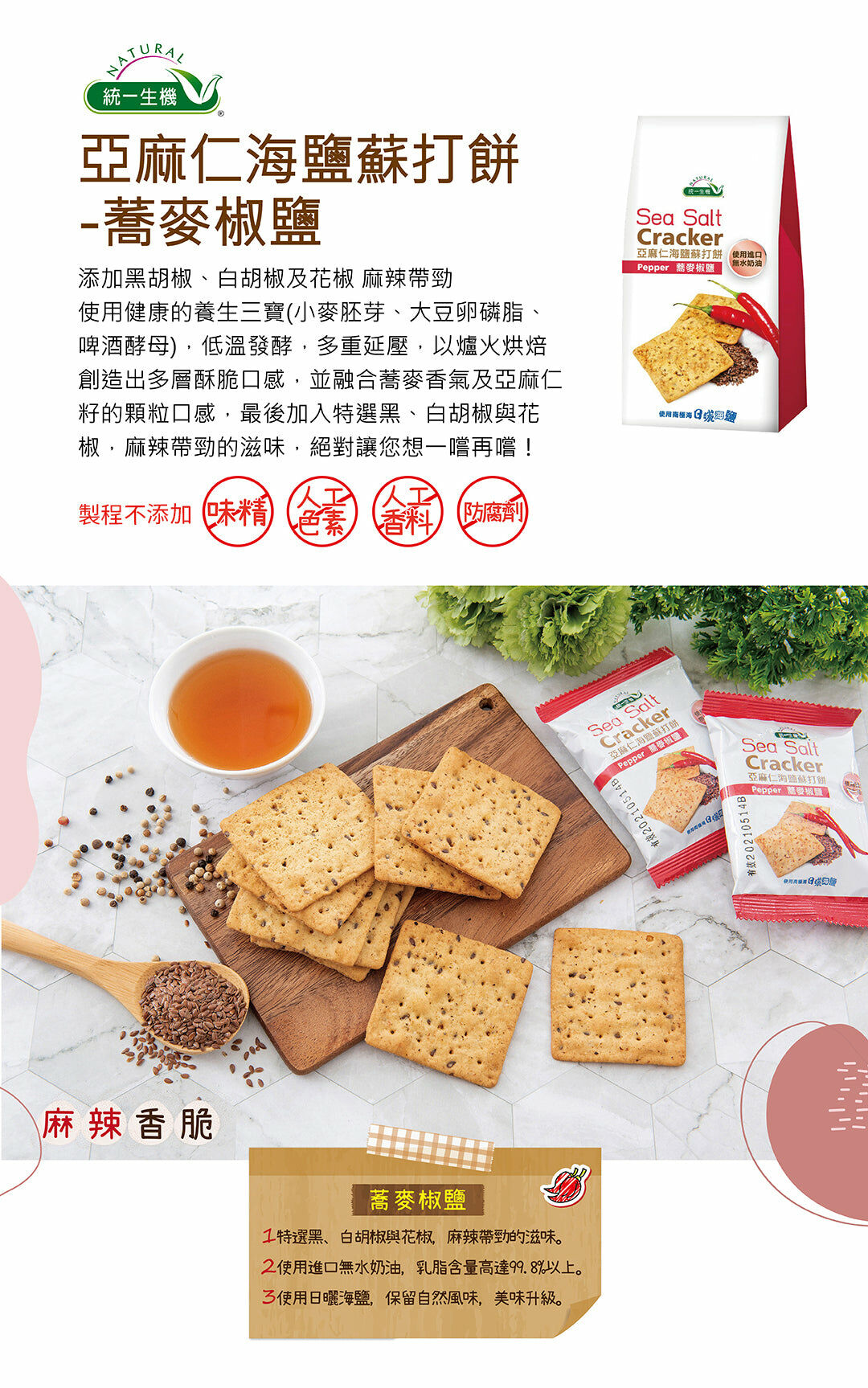 ◆ 原料:麵粉、椰子油、無水奶油、蔗糖、蕎麥粉、水、亞麻仁籽、大豆卵磷脂、日曬海鹽、啤酒酵母、新鮮酵母(酵母、水、大豆卵磷脂)、俄力岡葉、小麥胚芽、紅辣椒、迷迭香、小蘇打、羅勒、白胡椒粉、黑胡椒粉、洋香菜葉、花椒粉、蛋白分解酵素(小麥粉、蛋白分解酵素) 食品添加物:蛋白分解酵素、小蘇打 ◆ 規格:168g/袋 ◆ 產地:台灣 ◆ 保存期間:12個月(係指未開封狀態且正常條件下之保存) |