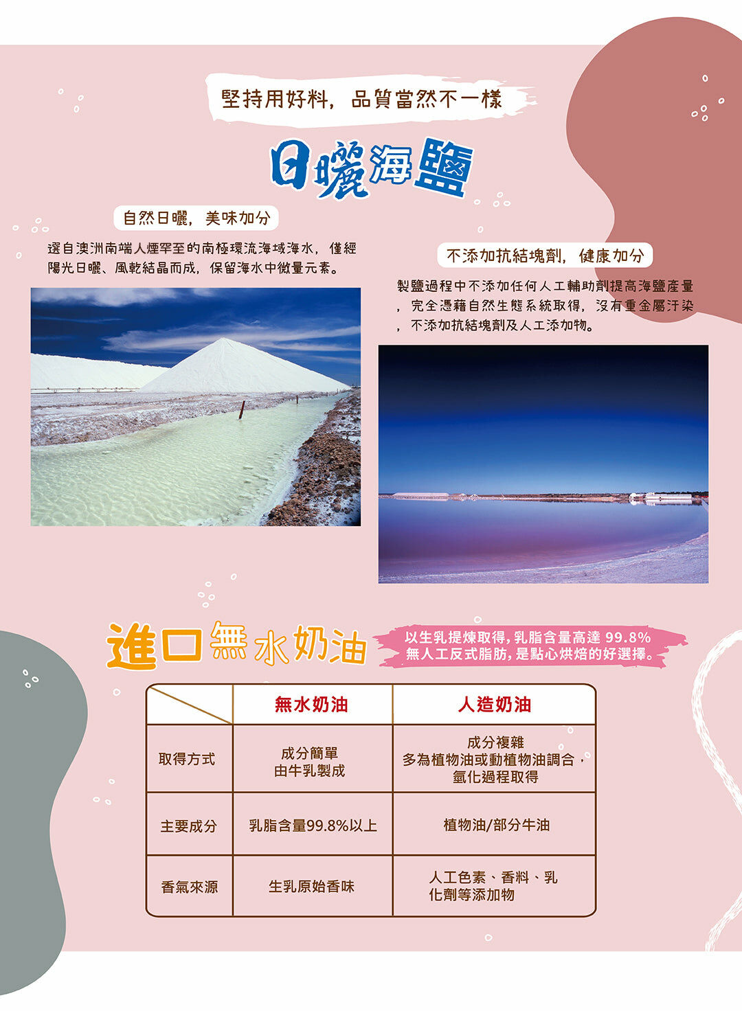 以生乳提煉取得,乳脂含量高達99.8%,無人工反式脂肪,是點心烘焙的好選擇。