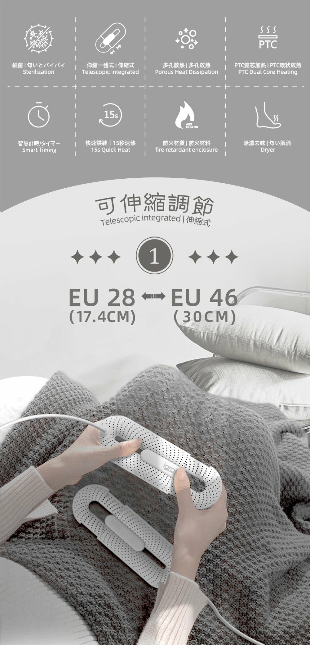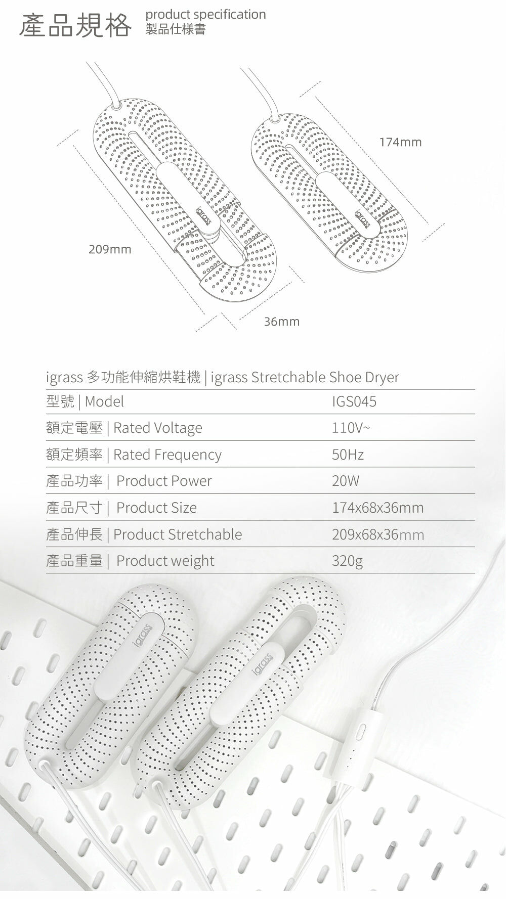 | ◆ 型號:IGS045 ◆ 額定電壓:110V- ◆ 額定頻率:50Hz ◆ 功率:20W ◆ 產品尺寸:174x68x36mm ◆ 產品伸長後尺寸:209x68x36mm ◆ 重量:320g |