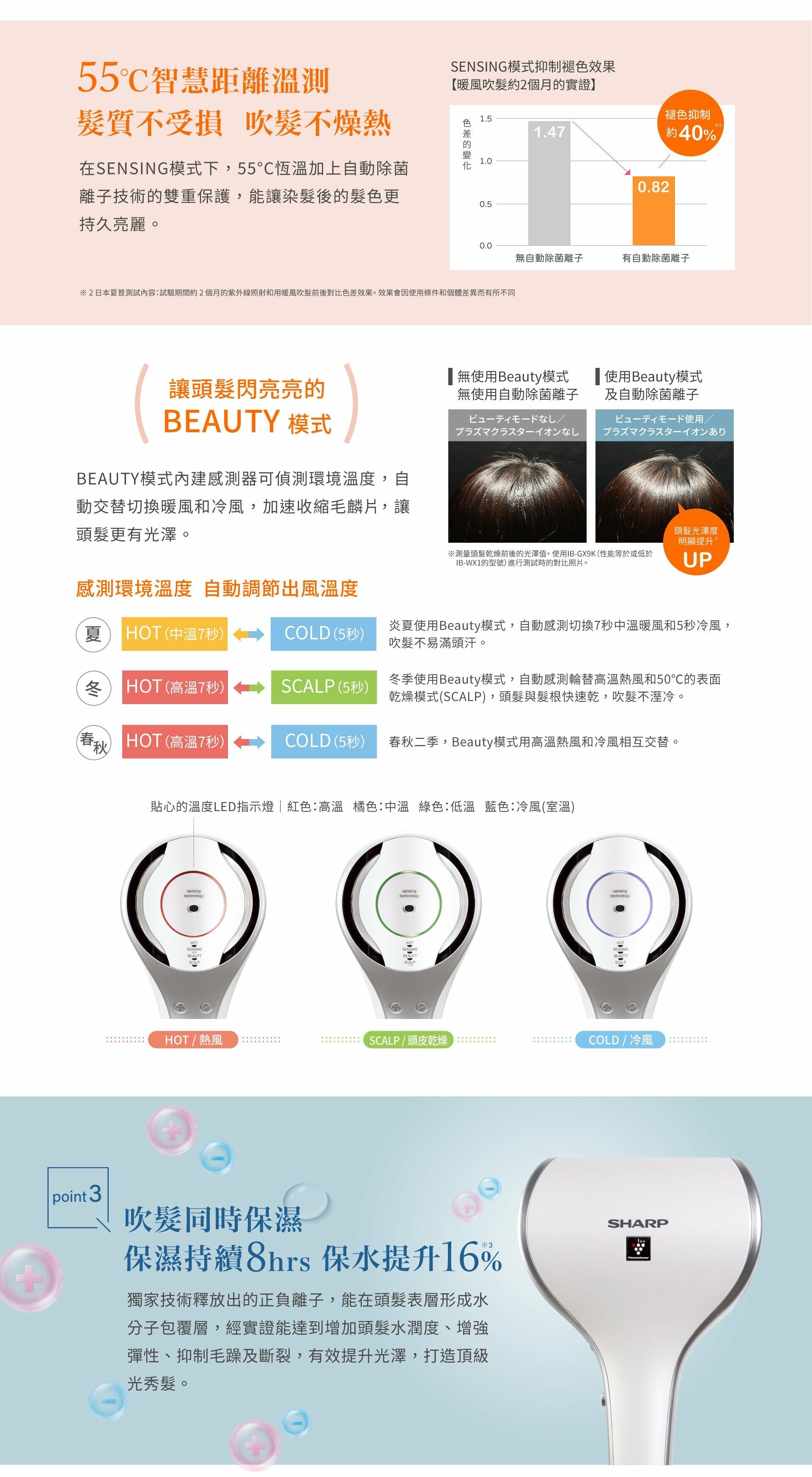 | 功能特色 | SENSING距離感測模式、美髮模式、智慧感應環境溫度、自動調整吹風、Plasmaculuster正負離子、秀髮保護、頭皮護理、大風量速乾技術 |