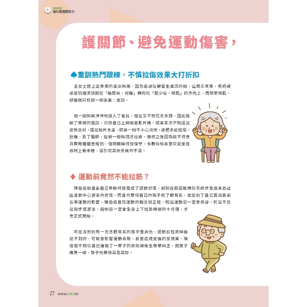 久坐比跪坐更傷膝!只做一種運動會傷害髖膝踝關節;暖身與收操目的不同,動作顛倒可能受傷!4套均衡運動處方,3族群選對運動類別,32種5大運動暖身收操示範;名醫親授護膝保養操與原則,你可以不用換人工關節!