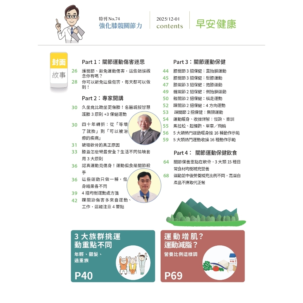 大家最重視的膝關節,台灣行醫40年的名醫明白地說,不是非得要自我放棄一般拖到最後,再去換人工關節;平時注意姿勢、做好保健操,「退化」不是必然。而大家最喜愛的飲食指南,針對關節保健也有系統性原理說明與好食材介紹。特別的是,運動前中後怎麼吃,增肌、減脂為目的的運動怎麼分配食物種類才不會失敗,本期一次說清楚。