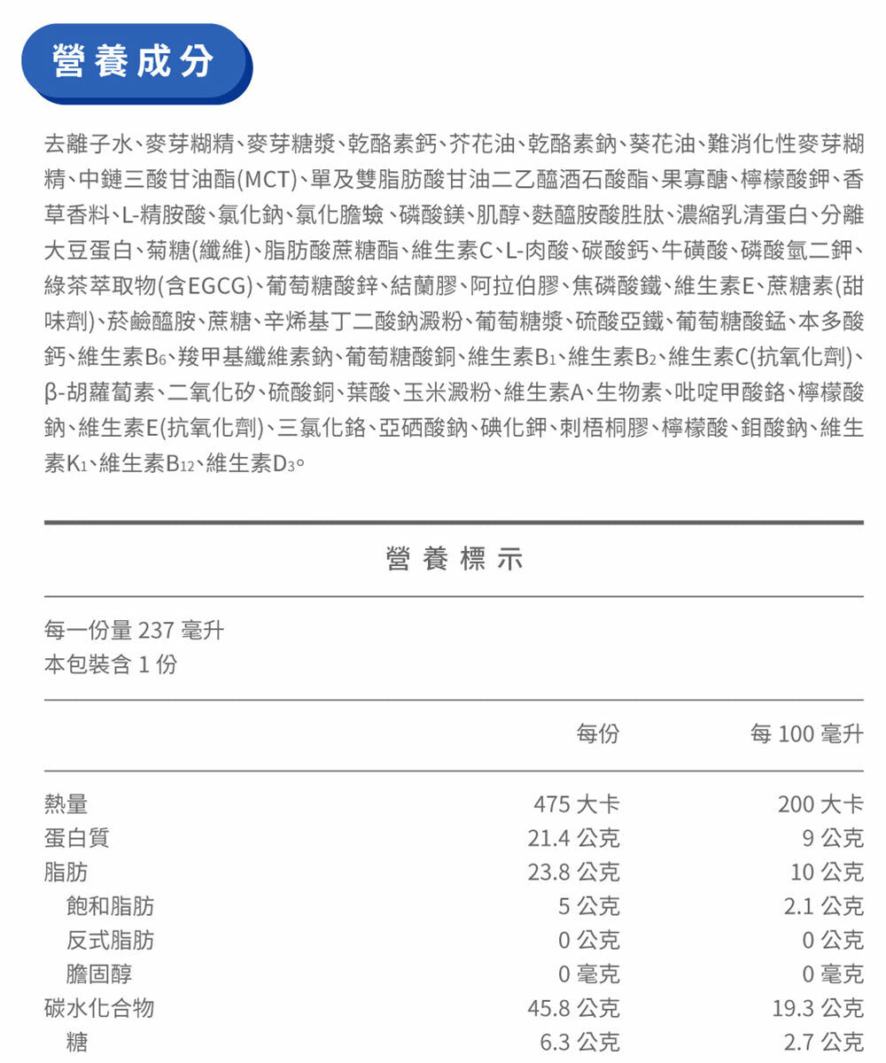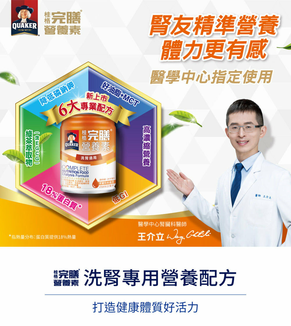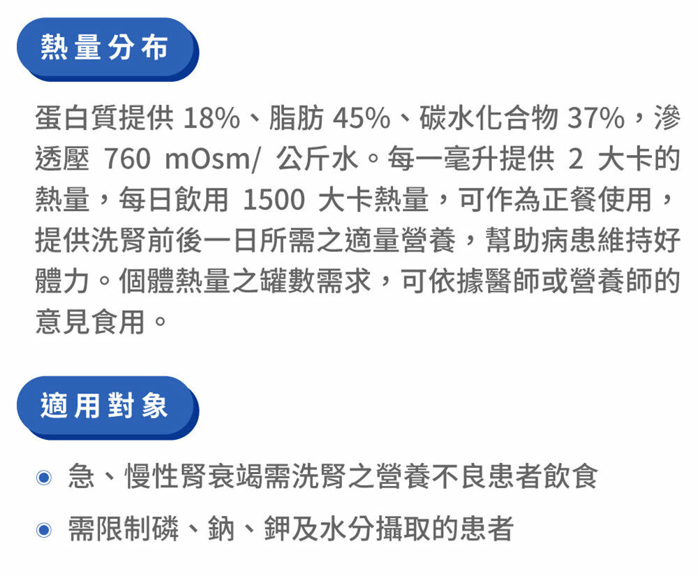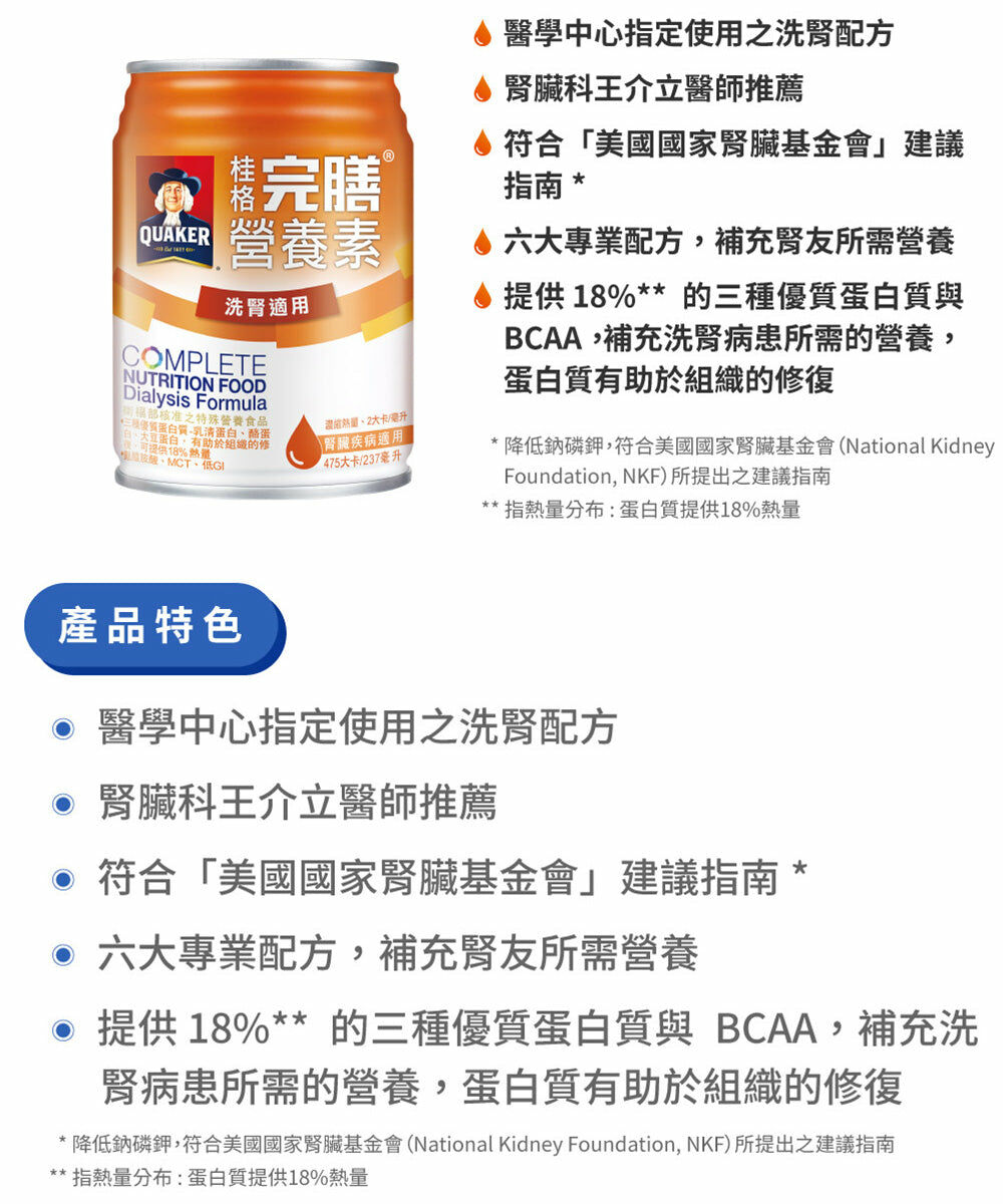 ◆ 商品名稱:【桂格】完膳洗腎適用配方237ML ◆規格:24罐/箱 ◆成份:去離子水、麥芽糊精、麥芽糖漿、乾酪素鈣、芥花油、乾酪素鈉、葵花油、難消化性麥芽糊精、中鏈三酸甘油酯(MCT)、單及雙脂肪酸甘油二乙醯酒石酸酯、果寡醣、檸檬酸鉀、香草香料、L-精胺酸、氯化鈉、氯化膽生僉、磷酸鎂、肌醇、麩醯胺酸胜肽、濃縮乳清蛋白、分離大豆蛋白、菊糖(纖維)、脂肪酸蔗糖酯、維生素C、L-肉酸、碳酸鈣、牛磺酸、磷酸氫二鉀、綠茶萃取物(含EGCG)、葡萄糖酸鋅、結蘭膠、阿拉伯膠、焦磷酸鐵、維生素E、蔗糖素(甜味劑) 、菸鹼醯胺、蔗糖、辛烯基丁二酸鈉澱粉、葡萄糖漿、硫酸亞鐵、葡萄糖酸錳、本多酸鈣、維生素B6、羧甲基纖維素鈉、葡萄糖酸銅、維生素B1、維生素B2、維生素C(抗氧化劑)、β-胡蘿蔔素、二氧化矽、硫酸銅、葉酸、玉米澱粉、維生素A、生物素、吡啶甲酸鉻、檸檬酸鈉、維生素E(抗氧化劑)、三氯化鉻、亞硒酸鈉、碘化鉀、刺梧桐膠、檸檬酸、鉬酸鈉、維生素K1、維生素B12、維生素D3 ◆產地:台灣 ◆保存總效期:15 個月 ◆保存方式:本產品經高溫滅菌處理,未開封前可置於常溫中保存。 ◆有效期限:標示於外包裝上(西元年/月/日) ◆食用說明: