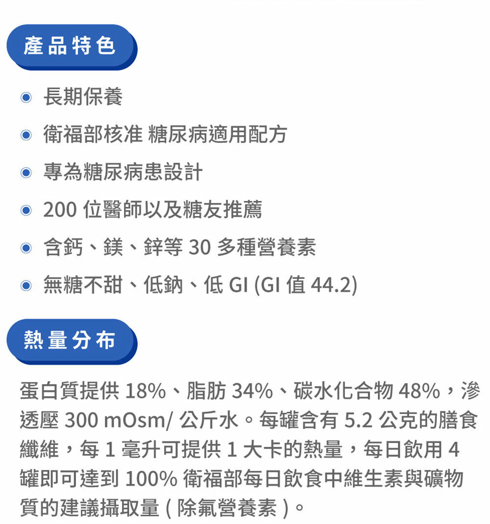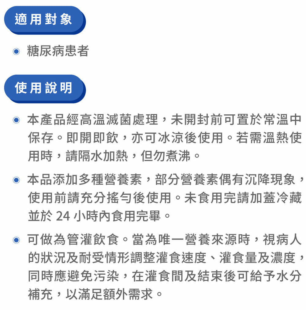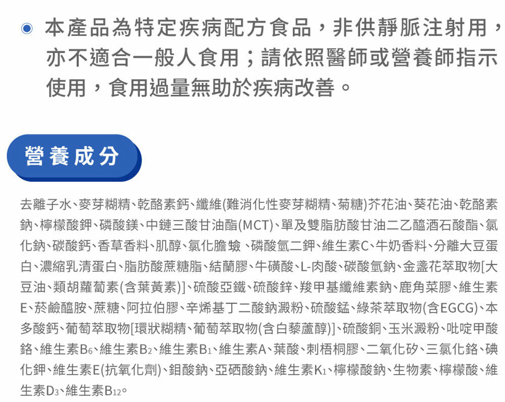 ◆注意事項:本產品為特定疾病配方食品, 提高鉻 非供靜脈注射用,亦不適合一般人食用;請依照醫師或營養師指示使用,食用過量無助於疾病改善 |