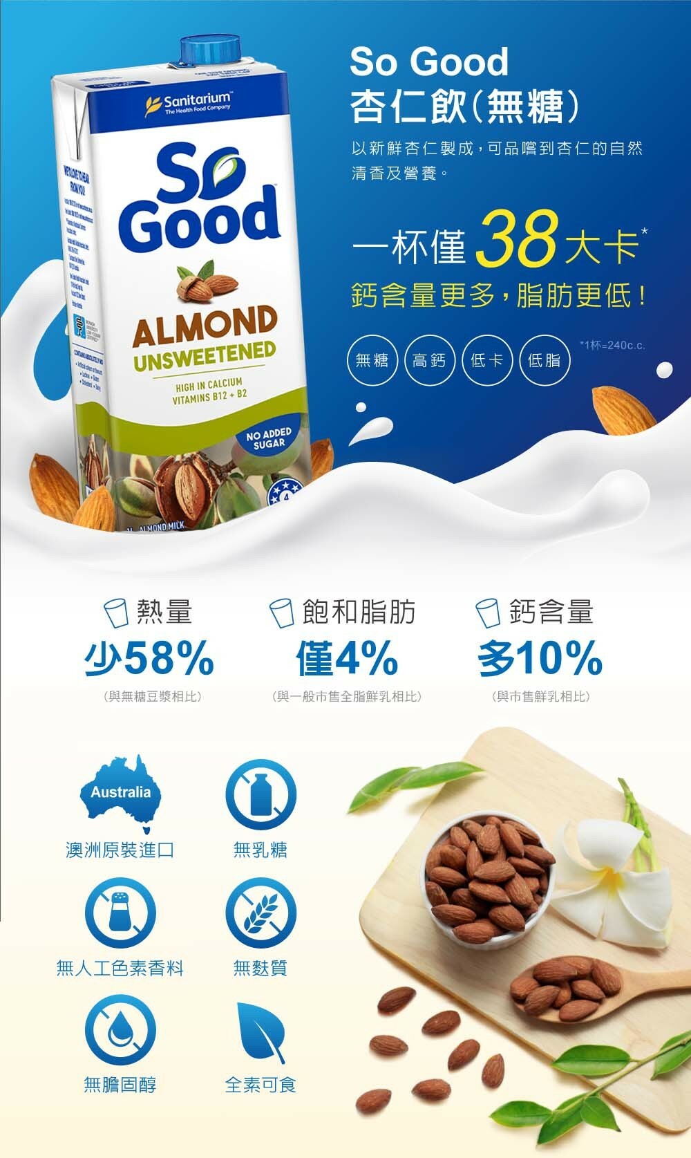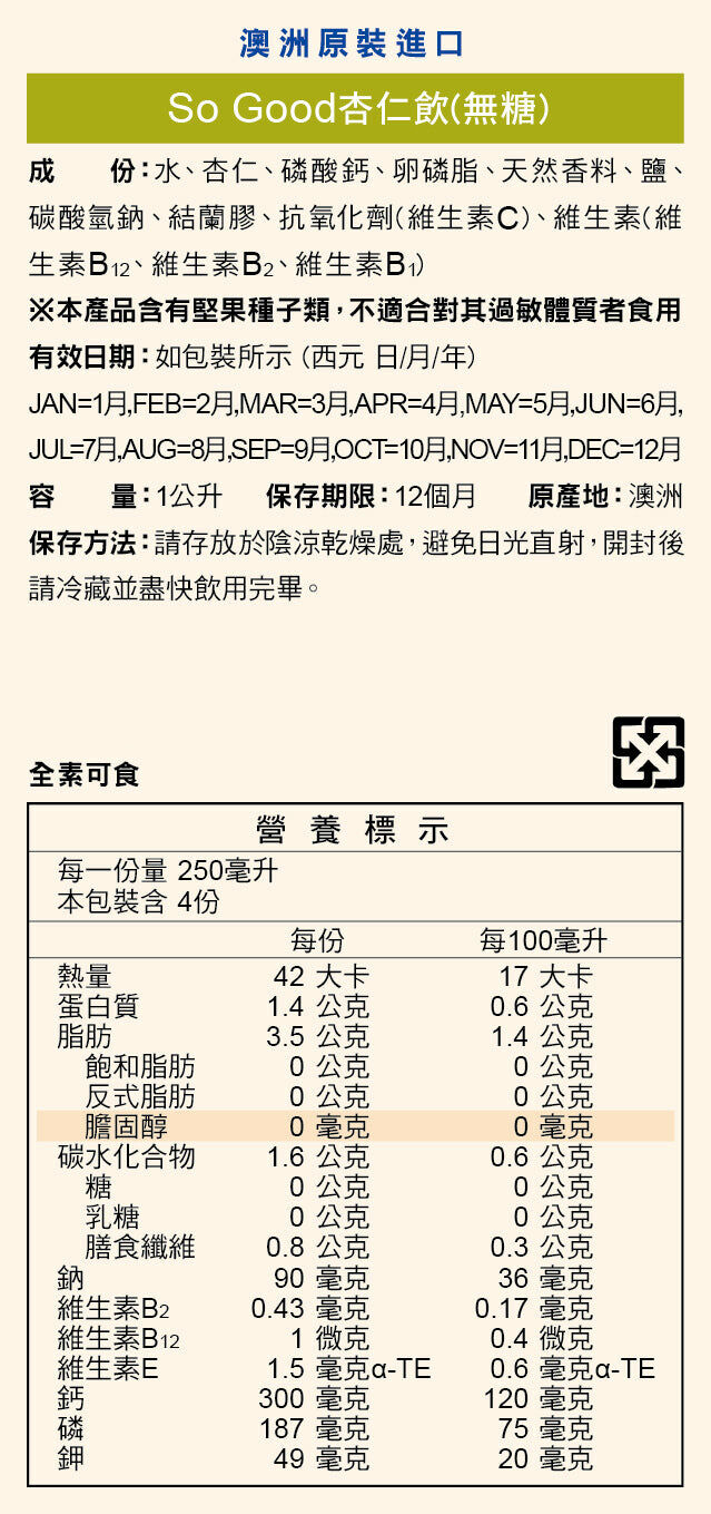 新鮮堅果杏仁製成,比牛奶更高鈣更低脂,乳糖不耐症都可喝