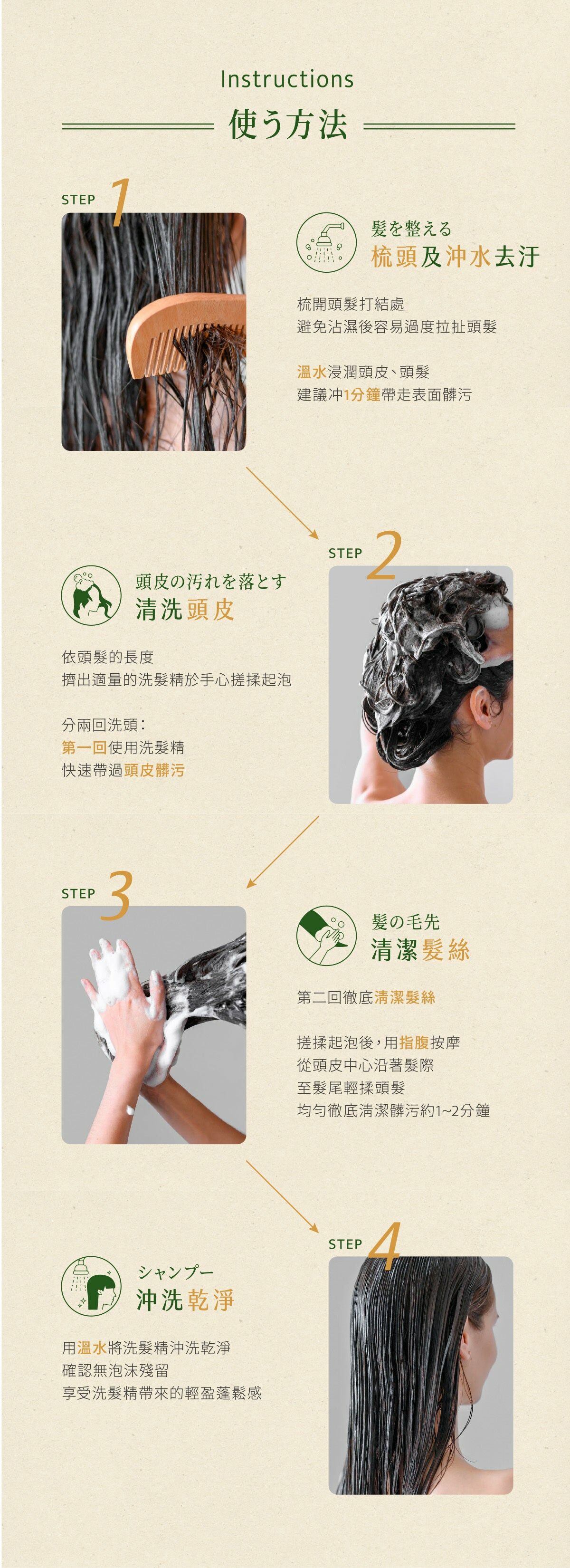 將頭髮淋濕以一半用量洗髮精擠於掌心,“加水搓泡”後使用於“頭皮”,先帶走灰塵與臟汙。