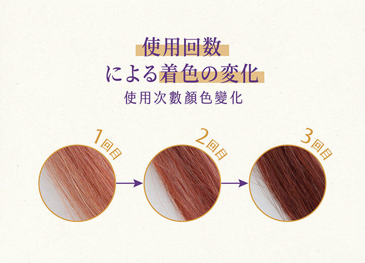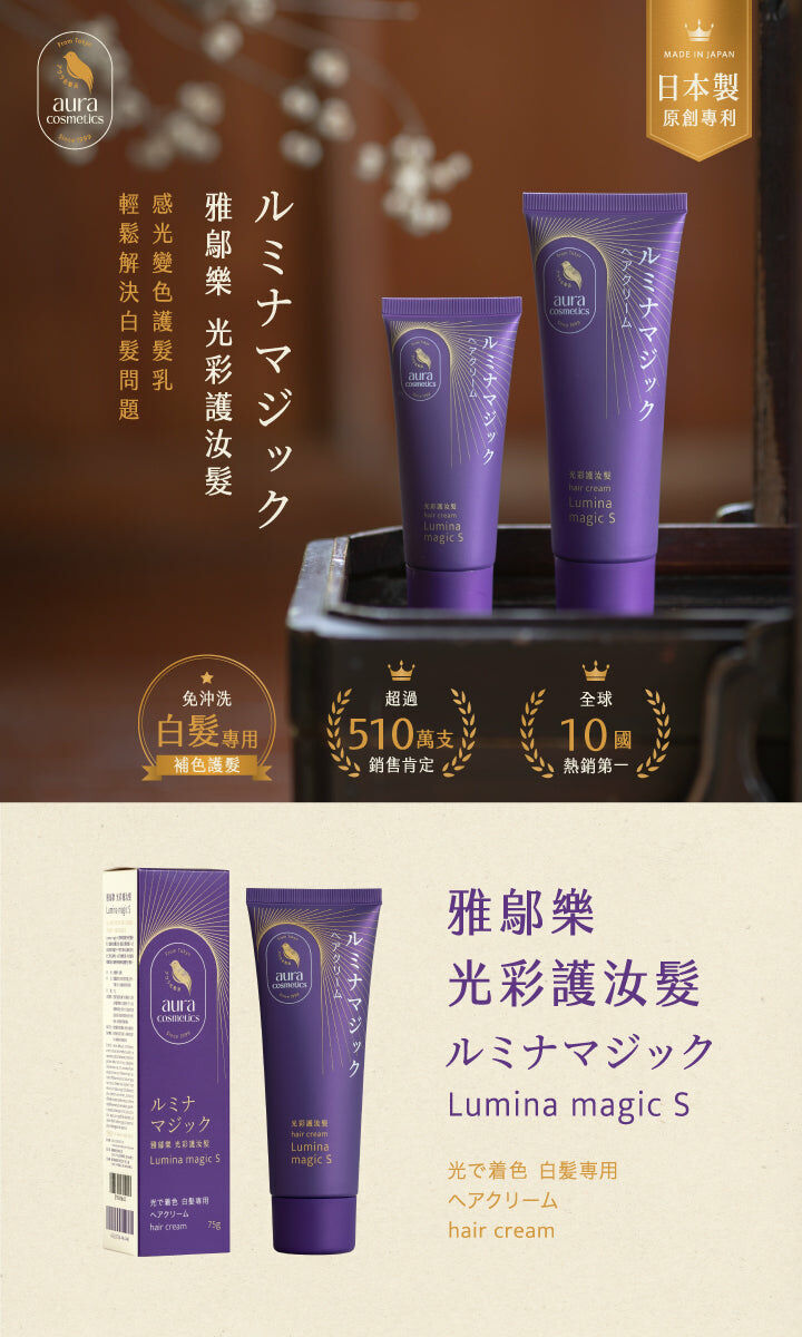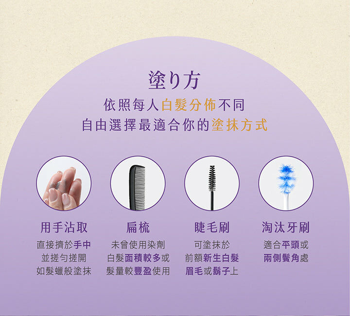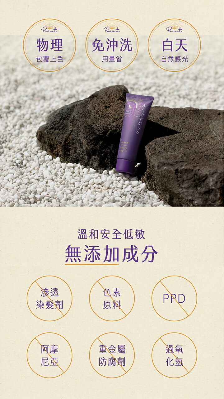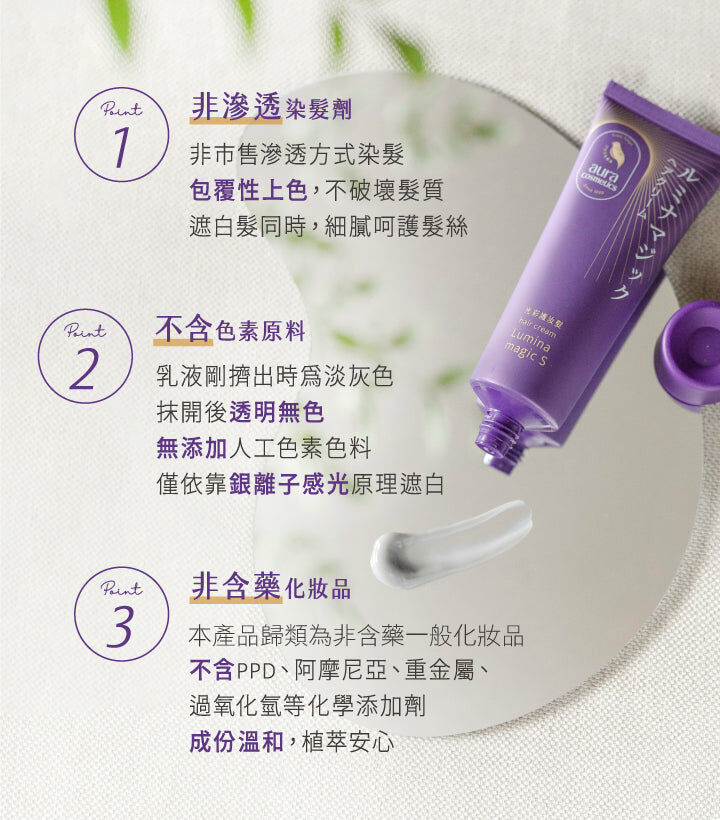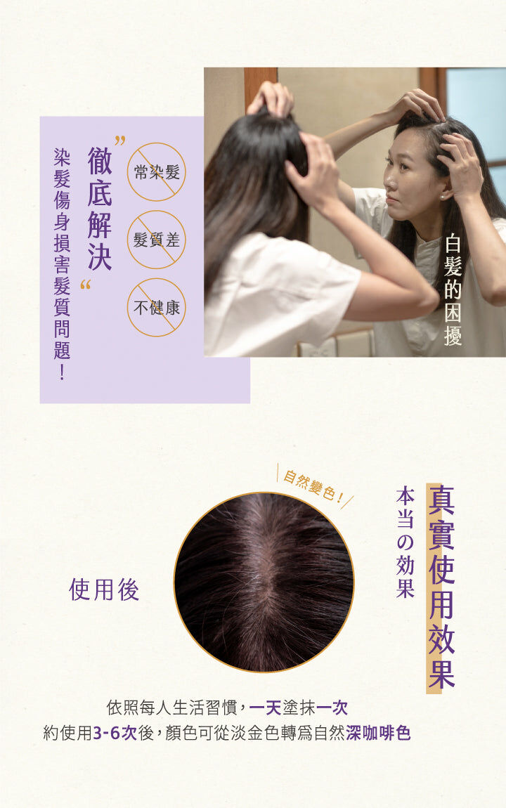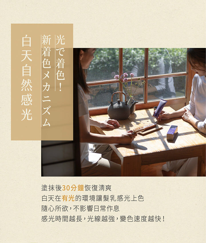 不同於傳統氧化染髮劑,不破壞髮色、髮質。塗抹後包覆白髮,感光變色的護髮乳