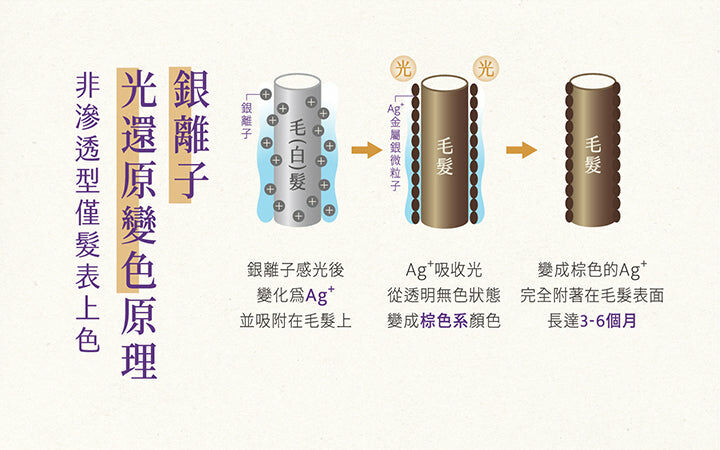 ※銀離子附著在白髮外層的毛鱗片表面,洗髮後