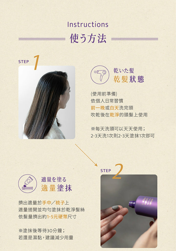 水含量,滲透至髮絲深層。賦予秀髮緊緻強韌度撫平毛躁不易斷裂。