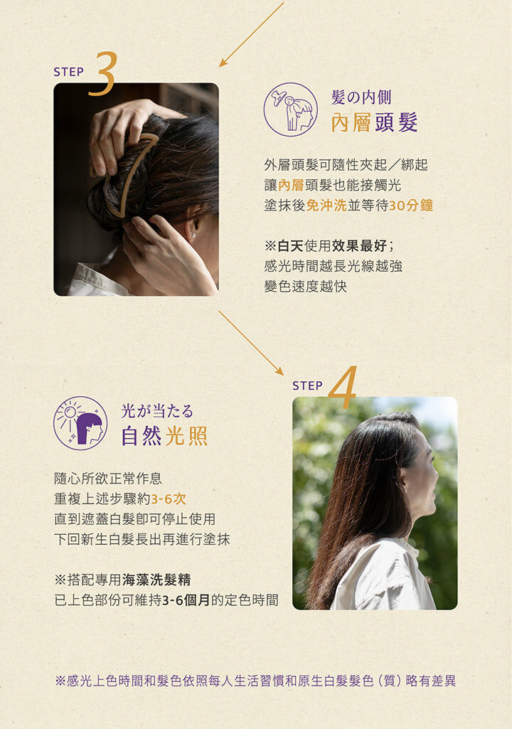 ※感光上色時間和髮色依照每人生活習慣和原生白髮髮色(質)略有差異