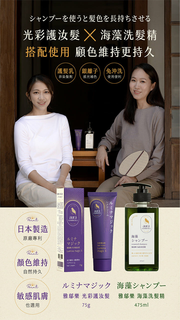 可以搭配aura雅鄔樂日本原廠研發室,專為光彩謢汝髮及台灣海島型氣候所量身訂做的海藻洗髮精,使用光彩護汝髮後已經定色的時間可以維持大約3-6個月的定色時間