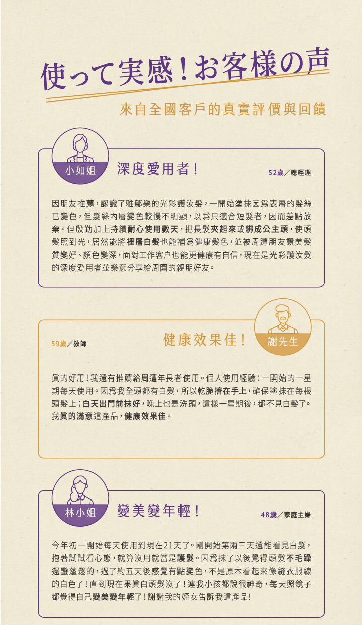 A:光彩使用量則是看每個人使用的髮量多寡有所不同,若是使用在每月新生白髮上可以用3-6個月沒問題。