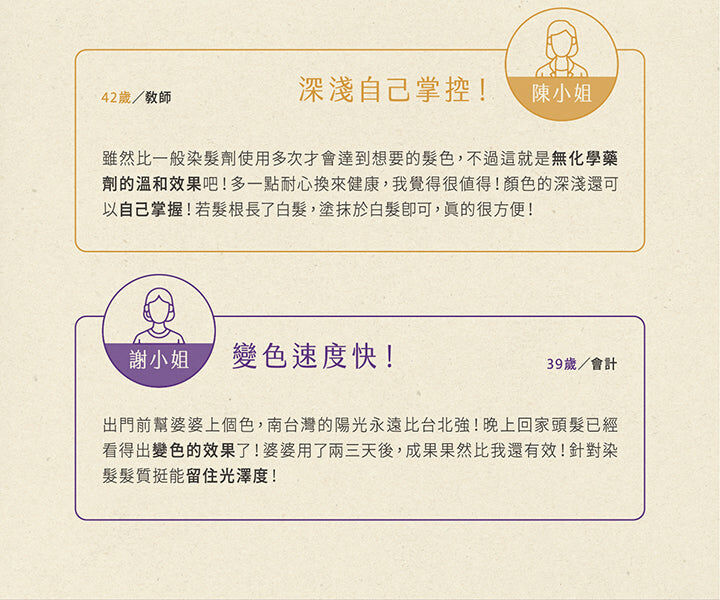不是滲透型染髮劑,不含PPD、阿摩尼亞、色素色料、重金屬成份、防腐劑、過氧化氫 等。