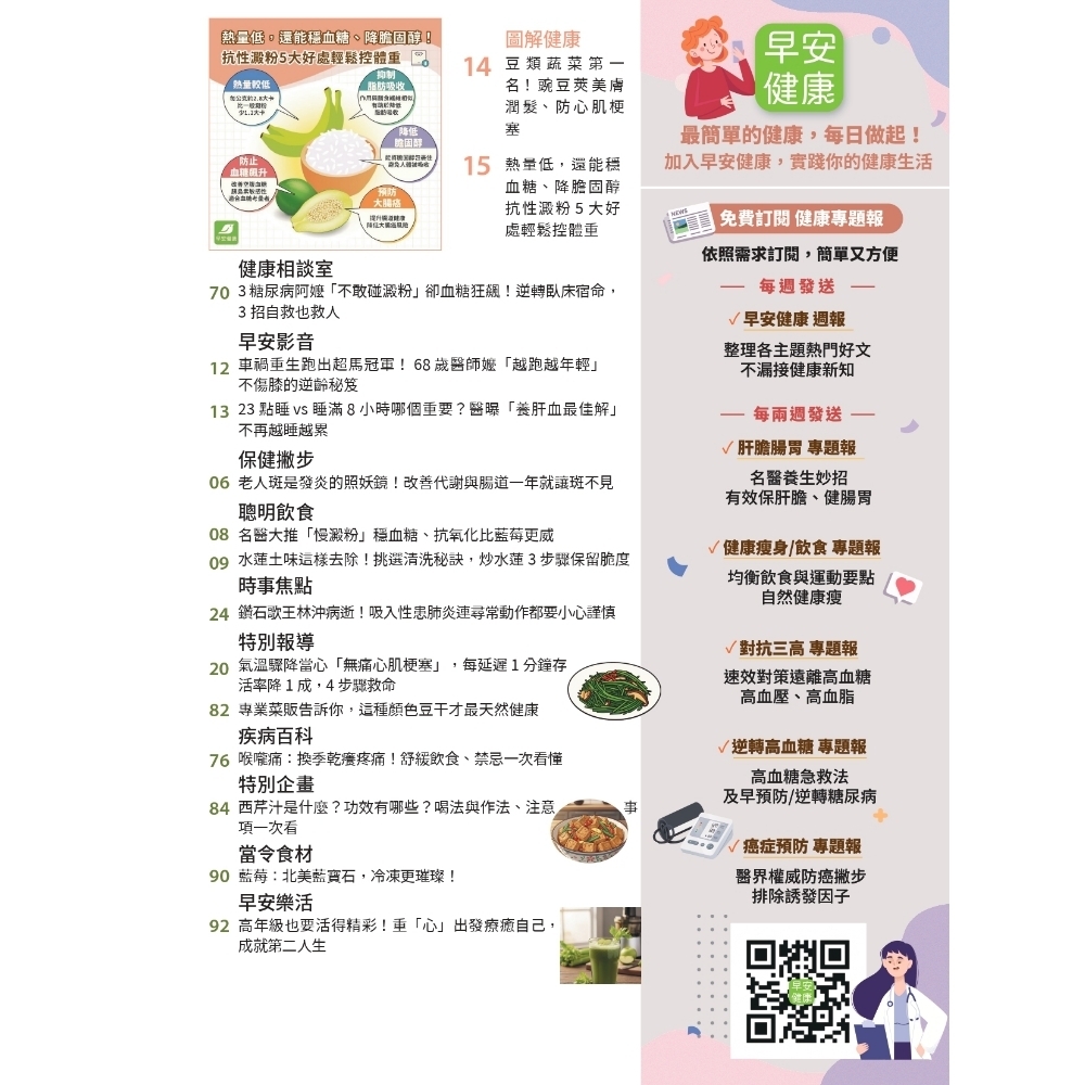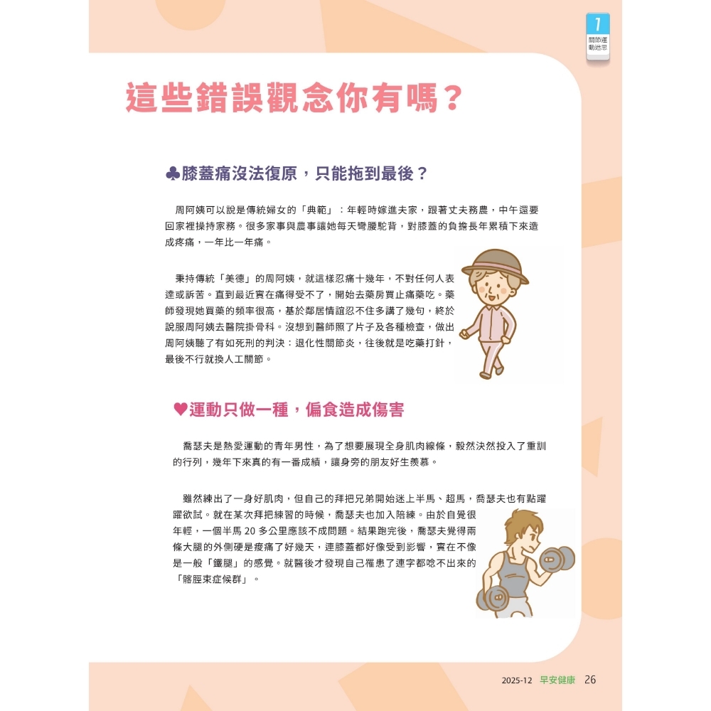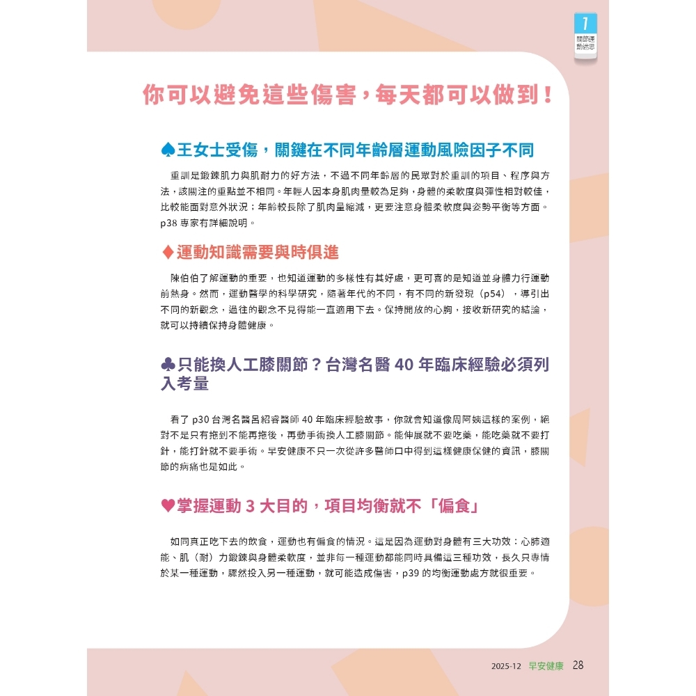 大家最重視的膝關節,台灣行醫40年的名醫明白地說,不是非得要自我放棄一般拖到最後,再去換人工關節;平時注意姿勢、做好保健操,「退化」不是必然。而大家最喜愛的飲食指南,針對關節保健也有系統性原理說明與好食材介紹。特別的是,運動前中後怎麼吃,增肌、減脂為目的的運動怎麼分配食物種類才不會失敗,本期一次說清楚。