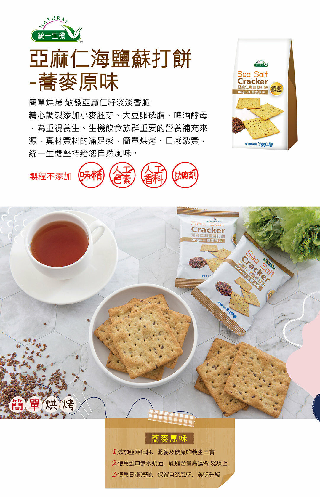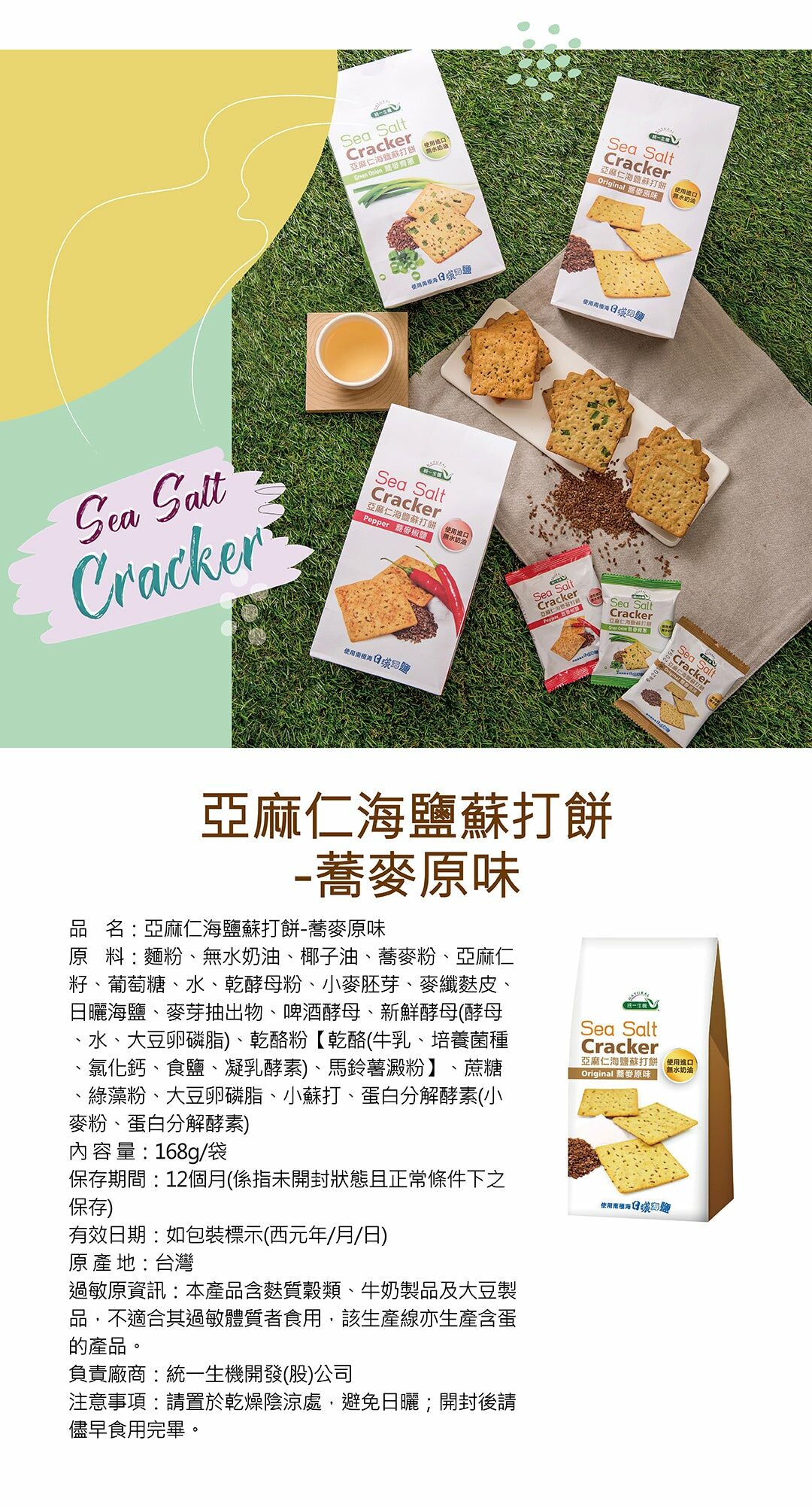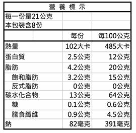 ◆ 原料:麵粉、無水奶油、椰子油、蕎麥粉、亞麻仁籽、葡萄糖、水、乾酵母粉、小麥胚芽、麥纖麩皮、日曬海鹽、麥芽抽出物、啤酒酵母、新鮮酵母(酵母、水、大豆卵磷脂)、乾酪粉【乾酪(牛乳、培養菌種、氯化鈣、食鹽、凝乳酵素)、馬鈴薯澱粉】、乳固形物、檸檬酸)、蔗糖、綠藻粉、大豆卵磷脂、小蘇打、蛋白分解酵素(小麥粉、蛋白分解酵素)。 ◆ 食品添加物:蛋白分解酵素、小蘇打 ◆ 規格:168g/袋 ◆ 產地:台灣 ◆ 保存期間:12個月(係指未開封狀態且正常條件下之保存) |