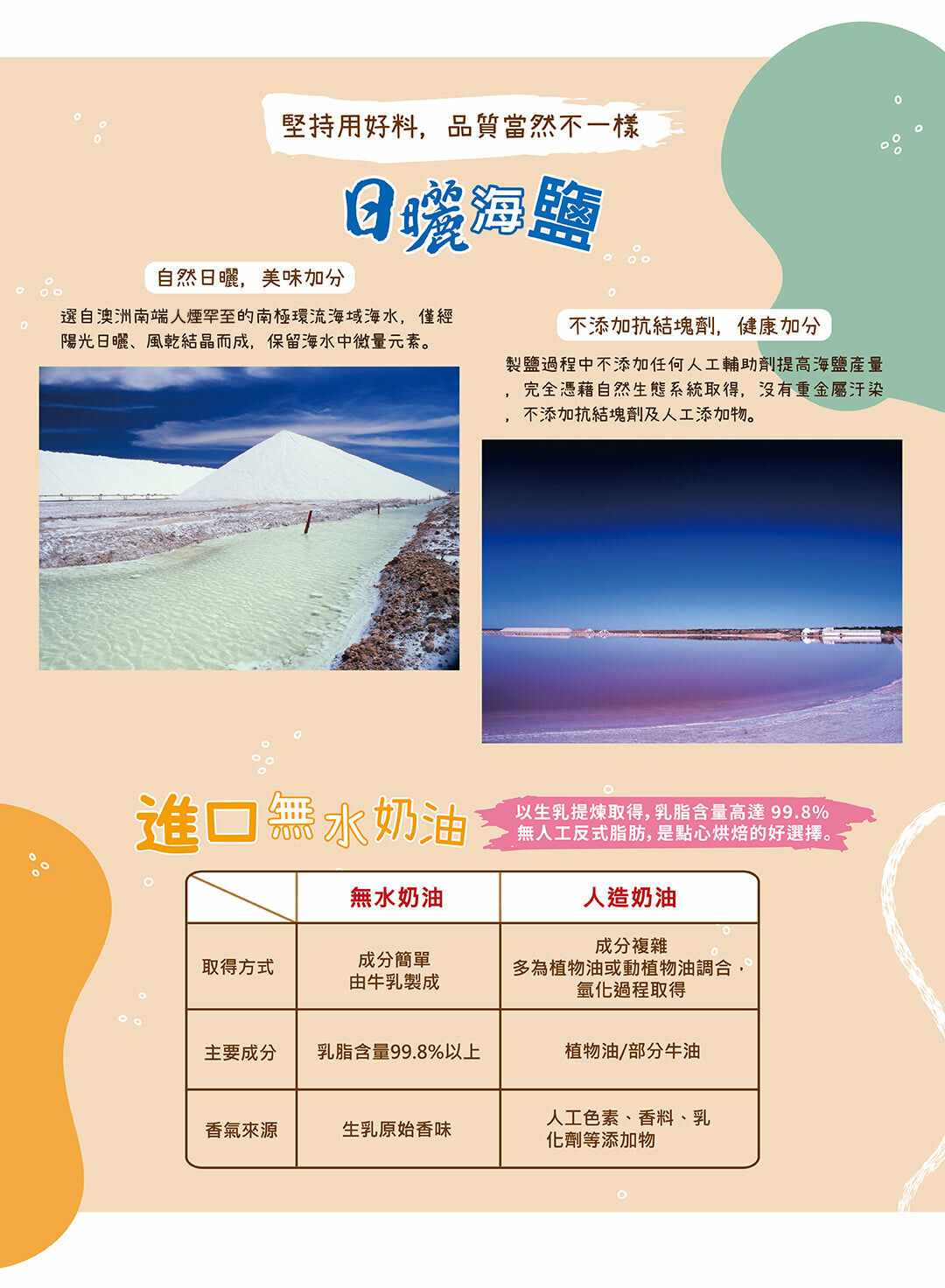 以生乳提煉取得,乳脂含量高達99.8%,無人工反式脂肪,是點心烘焙的好選擇。